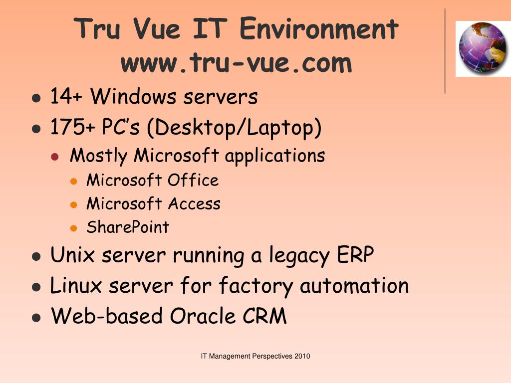 Tru Vue IT Environmentwww.tru-vue.com • 14+ Windows servers • 175+ PC’s (Desktop/Laptop) • Mostly Microsoft applications • Microsoft Office • Microsoft Access • SharePoint • Unix server running a legacy ERP • Linux server for factory automation • Web-based Oracle CRM IT Management Perspectives 2010