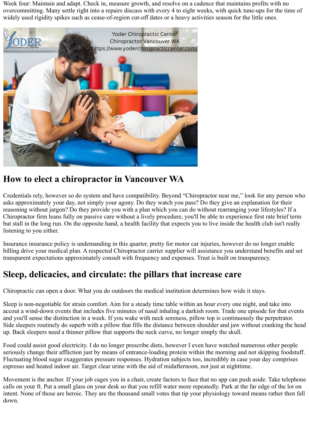 We also merit from an outdoors lifestyle. The comparable trails that could overdo it on a primary sunny weekend became surprising rehab instruments when used intelligently. Walking the flat sections of the Waterfront path at a comfy pace, two times a day for ten mins, is a efficient intervention for low returned suffering flares. It pumps vitamins into discs and brakes the pressure spiral more readily than mattress relax. What a primary month can look like People recurrently ask how immediately they might word transformations. Response varies by heritage and workload, but a user-friendly, lifelike development over a month seems like this: Week one: Reduce the flame. Two to 3 visits to calm the such a lot angry segments, escalate stove of motion, and decrease protecting muscle tone. Short, established walks, explicit respiratory cues, and replacing long static stretches with tender mobility paintings. Many worker's sleep more suitable through the 3rd or fourth nighttime, which amplifies enchancment. Yoder Chiropractic Center Phone: (360) 254-0994 Address: 2100 SE 164th Ave #102, Vancouver, WA 98683 Visit Yoder Chiropractic Center