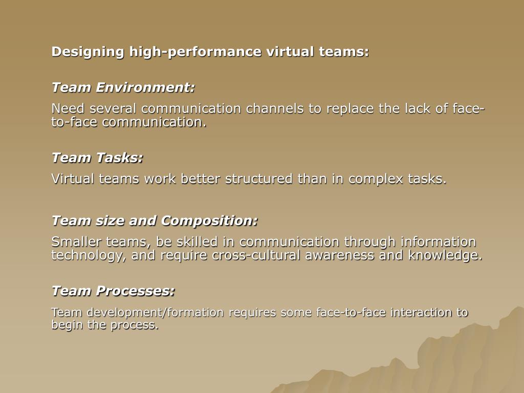 Designing high-performance virtual teams: Team Environment: Need several communication channels to replace the lack of face-to-face communication. Team Tasks: Virtual teams work better structured than in complex tasks. Team size and Composition: Smaller teams, be skilled in communication through information technology, and require cross-cultural awareness and knowledge. Team Processes: Team development/formation requires some face-to-face interaction to begin the process.
