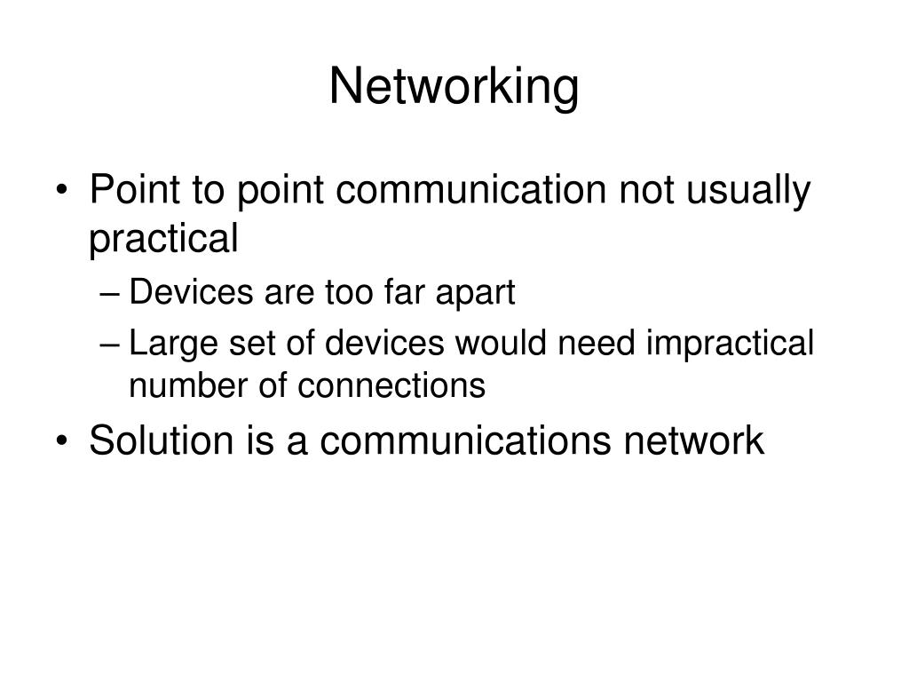 Networking • Point to point communication not usually practical • Devices are too far apart • Large set of devices would need impractical number of connections • Solution is a communications network