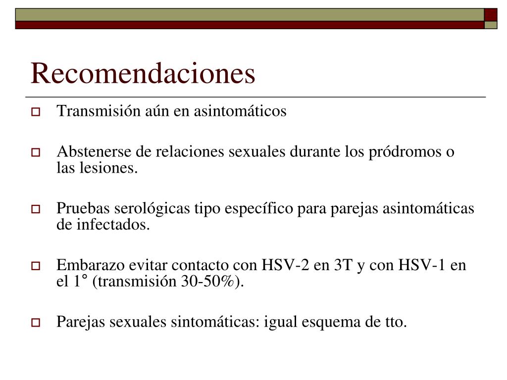 Recomendaciones • Transmisión aún en asintomáticos • Abstenerse de relaciones sexuales durante los pródromos o las lesiones. • Pruebas serológicas tipo específico para parejas asintomáticas de infectados. • Embarazo evitar contacto con HSV-2 en 3T y con HSV-1 en el 1° (transmisión 30-50%). • Parejas sexuales sintomáticas: igual esquema de tto.