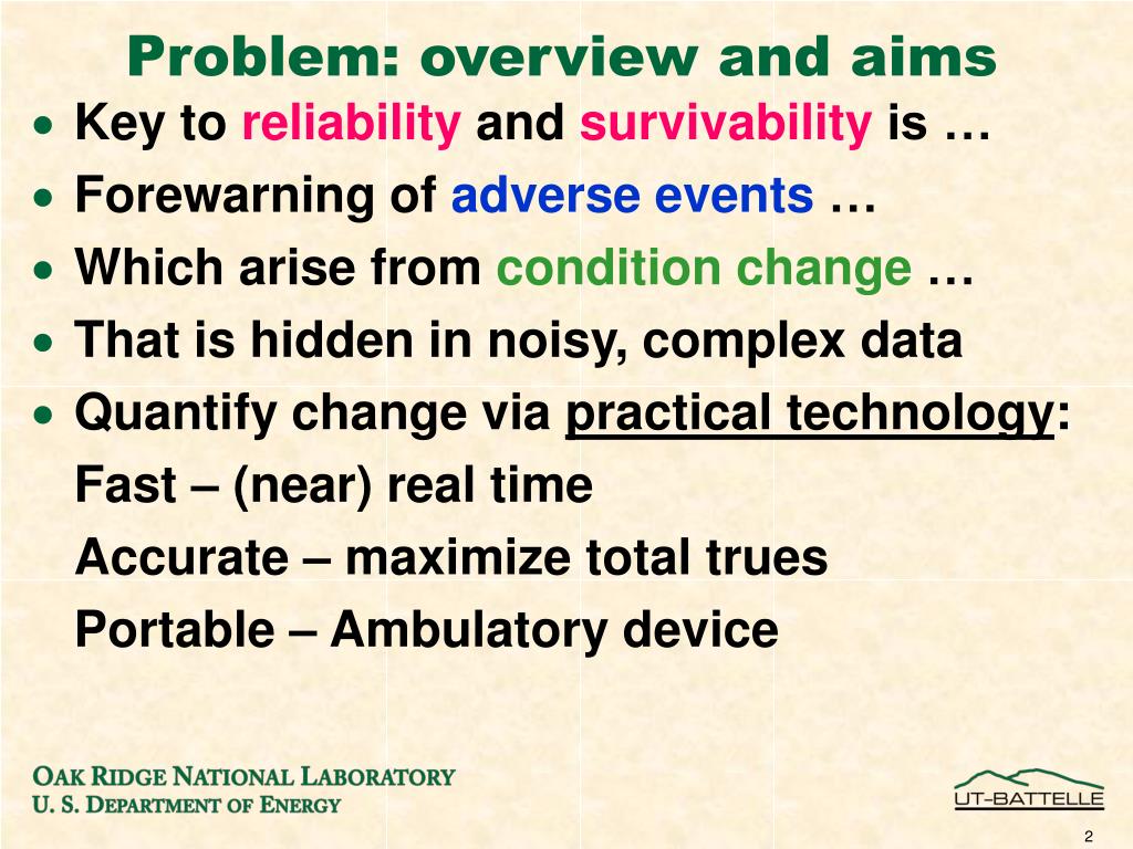 Problem: overview and aims • Key to reliability and survivability is … • Forewarning of adverse events … • Which arise from condition change … • That is hidden in noisy, complex data • Quantify change via practical technology: Fast – (near) real time Accurate – maximize total trues Portable – Ambulatory device