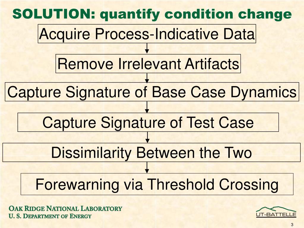 SOLUTION: quantify condition change Acquire Process-Indicative Data Remove Irrelevant Artifacts Capture Signature of Base Case Dynamics Capture Signature of Test Case Dissimilarity Between the Two Forewarning via Threshold Crossing