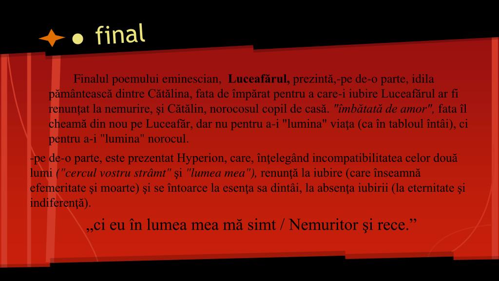 final Finalul poemului eminescian, Luceafărul, prezintă,-pe de-o parte, idila pământească dintre Cătălina, fata de împărat pentru a care-i iubire Luceafărul ar fi renunțat la nemurire, şi Cătălin, norocosul copil de casă. "îmbătată de amor", fata îl cheamă din nou pe Luceafăr, dar nu pentru a-i "lumina" viaţa (ca în tabloul întâi), ci pentru a-i "lumina" norocul. -pe de-o parte, este prezentat Hyperion, care, înţelegând incompatibilitatea celor două lumi ("cercul vostru strâmt" şi "lumea mea"), renunţă la iubire (care înseamnă efemeritate şi moarte) şi se întoarce la esenţa sa dintâi, la absenţa iubirii (la eternitate şi indiferenţă). „ci eu în lumea mea mă simt / Nemuritor şi rece.”