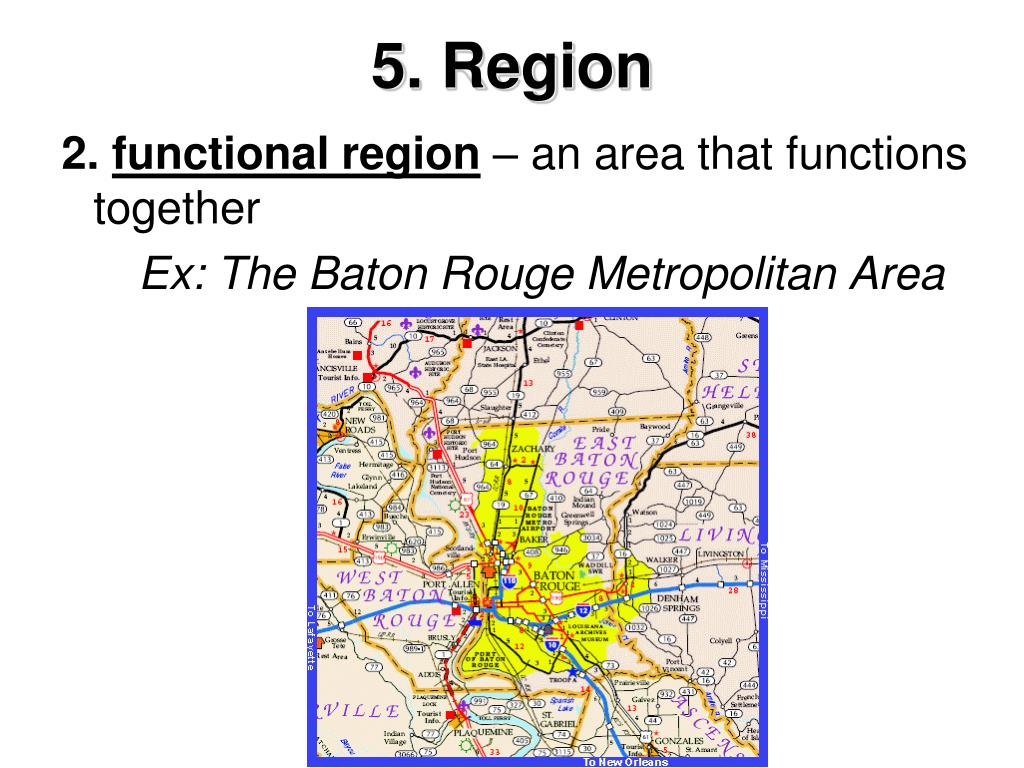 5. Region 2. functional region – an area that functions together Ex: The Baton Rouge Metropolitan Area