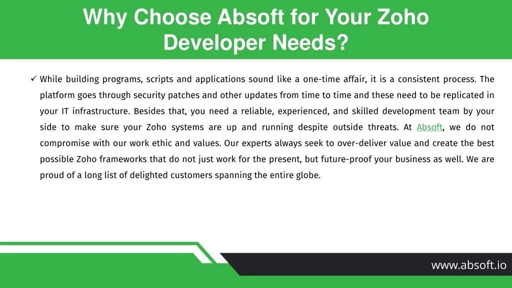 Why Choose Absoft for Your Zoho Developer Needs? • While building programs, scripts and applications sound like a one-time affair, it is a consistent process. The platform goes through security patches and other updates from time to time and these need to be replicated in your IT infrastructure. Besides that, you need a reliable, experienced, and skilled development team by your side to make sure your Zoho systems are up and running despite outside threats. At Absoft, we do not compromise with our work ethic and values. Our experts always seek to over-deliver value and create the best possible Zoho frameworks that do not just work for the present, but future-proof your business as well. We are proud of a long list of delighted customers spanning the entire globe. www.absoft.io
