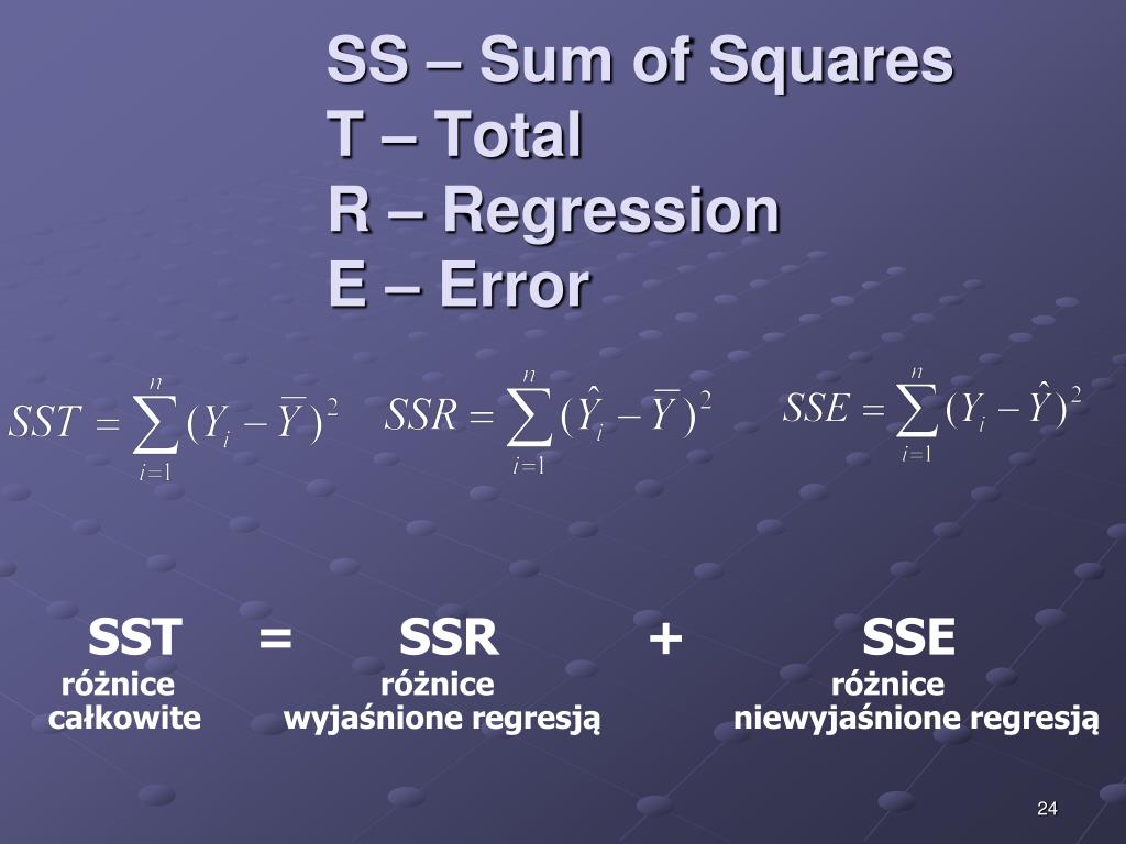 SS – Sum of SquaresT – TotalR – RegressionE – Error SST = SSR + SSE różnice różnice różnice całkowitewyjaśnione regresją niewyjaśnione regresją