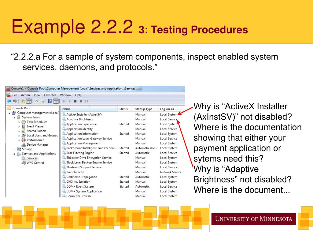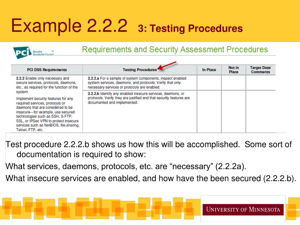 Example 2.2.2 3: Testing Procedures Test procedure 2.2.2.b shows us how this will be accomplished. Some sort of documentation is required to show: What services, daemons, protocols, etc. are “necessary” (2.2.2a). What insecure services are enabled, and how have the been secured (2.2.2.b).
