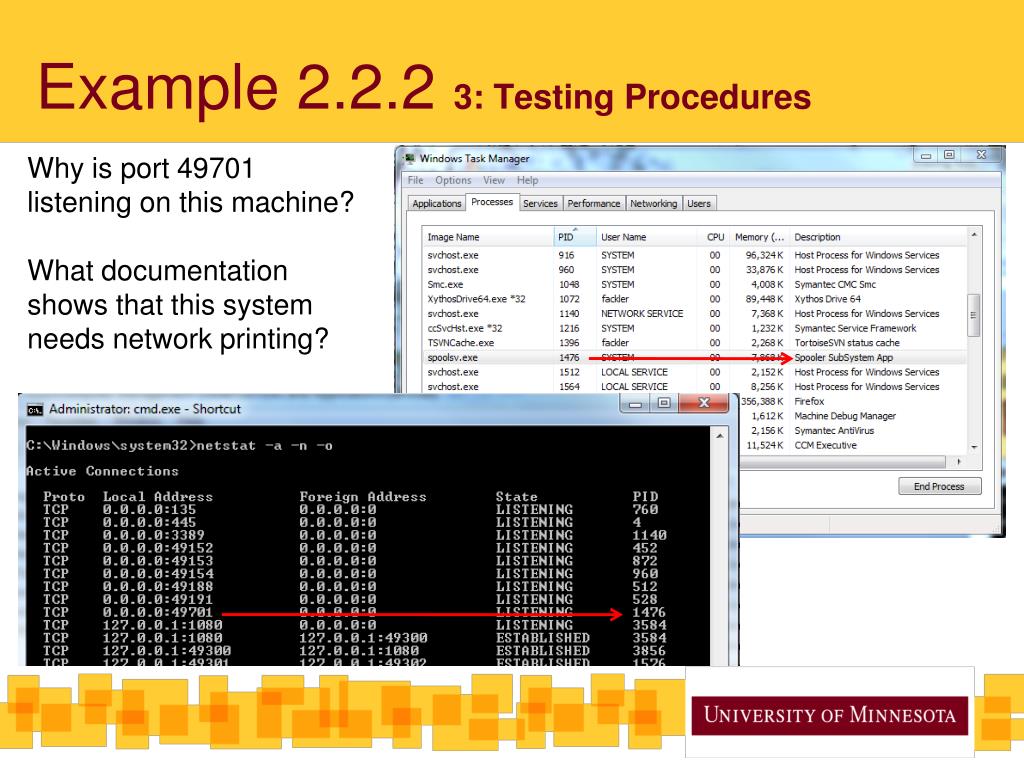 Example 2.2.2 3: Testing Procedures Why is port 49701 listening on this machine? What documentation shows that this system needs network printing?
