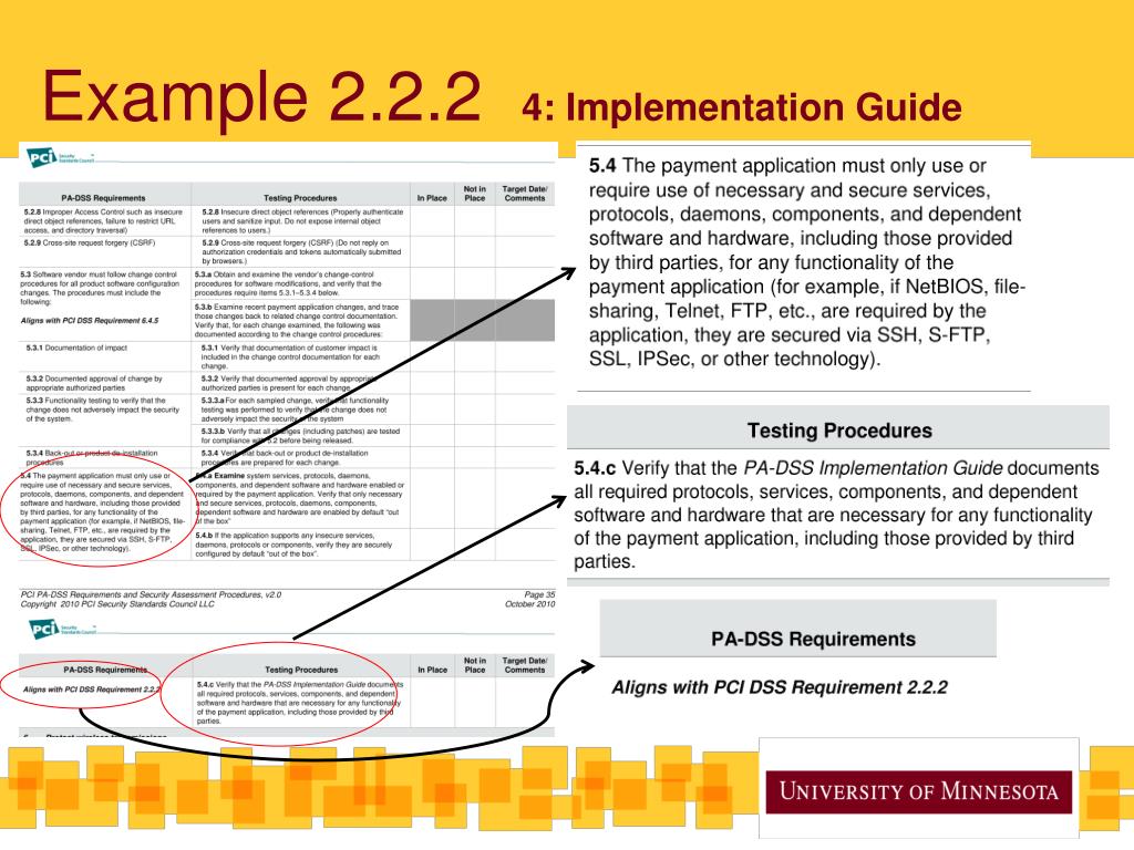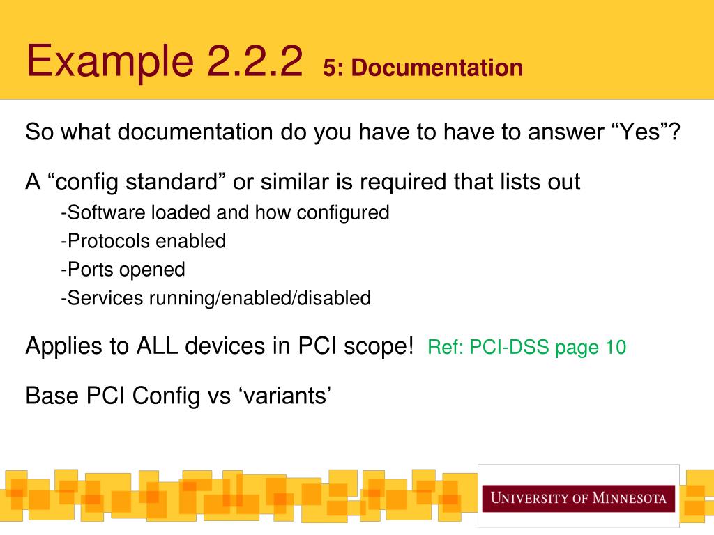 Example 2.2.2 5: Documentation So what documentation do you have to have to answer “Yes”? “this requirement should be part of your organization's configuration standards”(1) listing “necessary and secure services, protocols, daemons, etc., as required for the function of the system”(2). (1) Intent (2) PCI-DSS