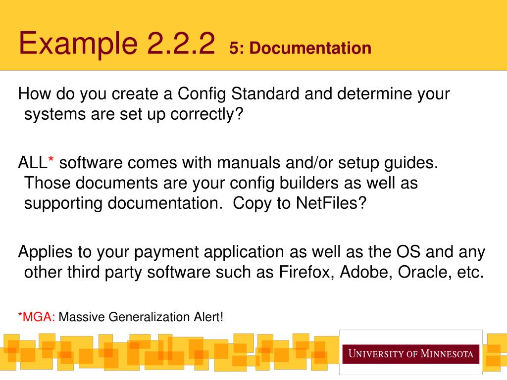Example 2.2.2 5: Documentation How do you create a Config Standard and determine your systems are set up correctly? ALL* software comes with manuals and/or setup guides. Those documents are your config builders as well as supporting documentation. Copy to NetFiles? Applies to your payment application as well as the OS and any other third party software such as Firefox, Adobe, Oracle, etc. *MGA: Massive Generalization Alert!
