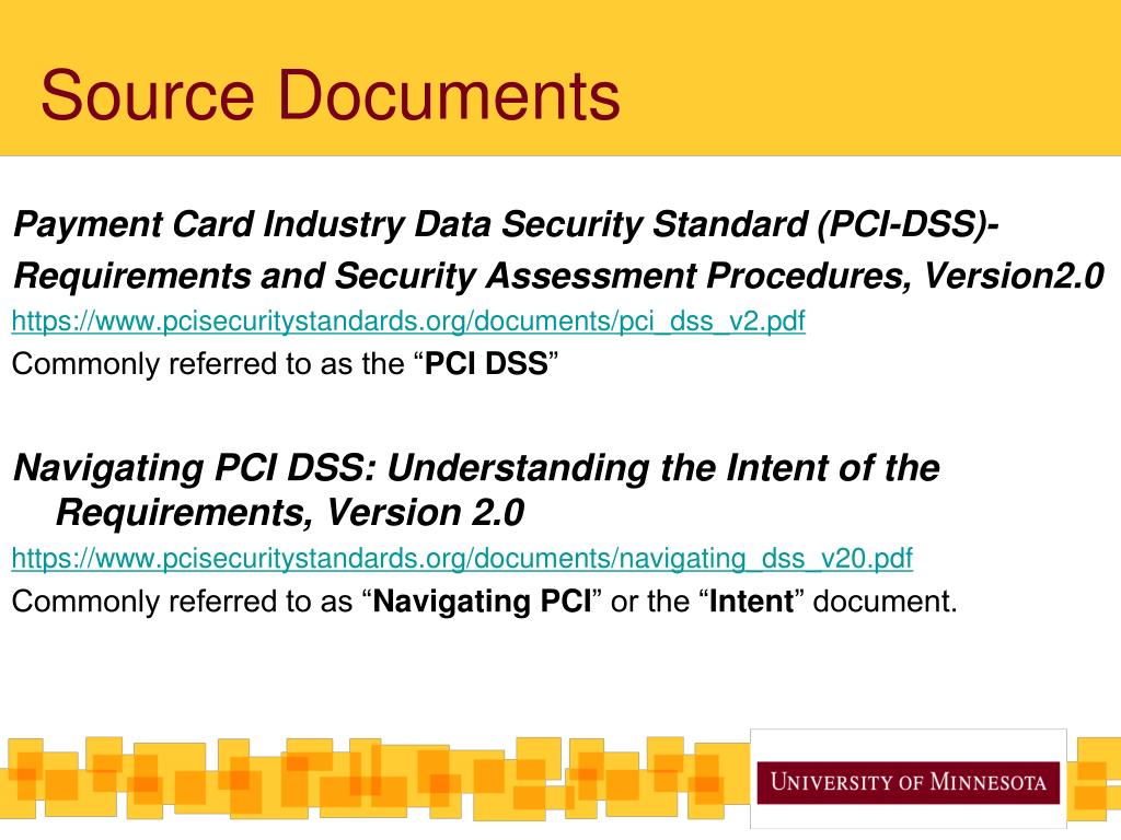 Source Documents Payment Card Industry Data Security Standard (PCI-DSS)- Requirements and Security Assessment Procedures, Version2.0 https://www.pcisecuritystandards.org/documents/pci_dss_v2.pdf Commonly referred to as the “PCI DSS” Navigating PCI DSS: Understanding the Intent of the Requirements, Version 2.0 https://www.pcisecuritystandards.org/documents/navigating_dss_v20.pdf Commonly referred to as “Navigating PCI” or the “Intent” document.