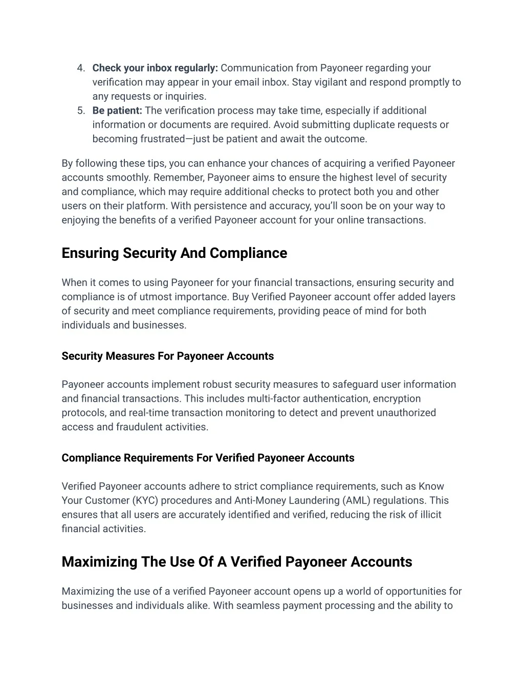 4. Check your inbox regularly: Communication from Payoneer regarding your verification may appear in your email inbox. Stay vigilant and respond promptly to any requests or inquiries. 5. Be patient: The verification process may take time, especially if additional information or documents are required. Avoid submitting duplicate requests or becoming frustrated—just be patient and await the outcome. By following these tips, you can enhance your chances of acquiring a verified Payoneer accounts smoothly. Remember, Payoneer aims to ensure the highest level of security and compliance, which may require additional checks to protect both you and other users on their platform. With persistence and accuracy, you’ll soon be on your way to enjoying the benefits of a verified Payoneer account for your online transactions. Ensuring Security And Compliance When it comes to using Payoneer for your financial transactions, ensuring security and compliance is of utmost importance. Buy Verified Payoneer account offer added layers of security and meet compliance requirements, providing peace of mind for both individuals and businesses. Security Measures For Payoneer Accounts Payoneer accounts implement robust security measures to safeguard user information and financial transactions. This includes multi-factor authentication, encryption protocols, and real-time transaction monitoring to detect and prevent unauthorized access and fraudulent activities. Compliance Requirements For Verified Payoneer Accounts Verified Payoneer accounts adhere to strict compliance requirements, such as Know Your Customer (KYC) procedures and Anti-Money Laundering (AML) regulations. This ensures that all users are accurately identified and verified, reducing the risk of illicit financial activities. Maximizing The Use Of A Verified Payoneer Accounts Maximizing the use of a verified Payoneer account opens up a world of opportunities for businesses and individuals alike. With seamless payment processing and the ability to