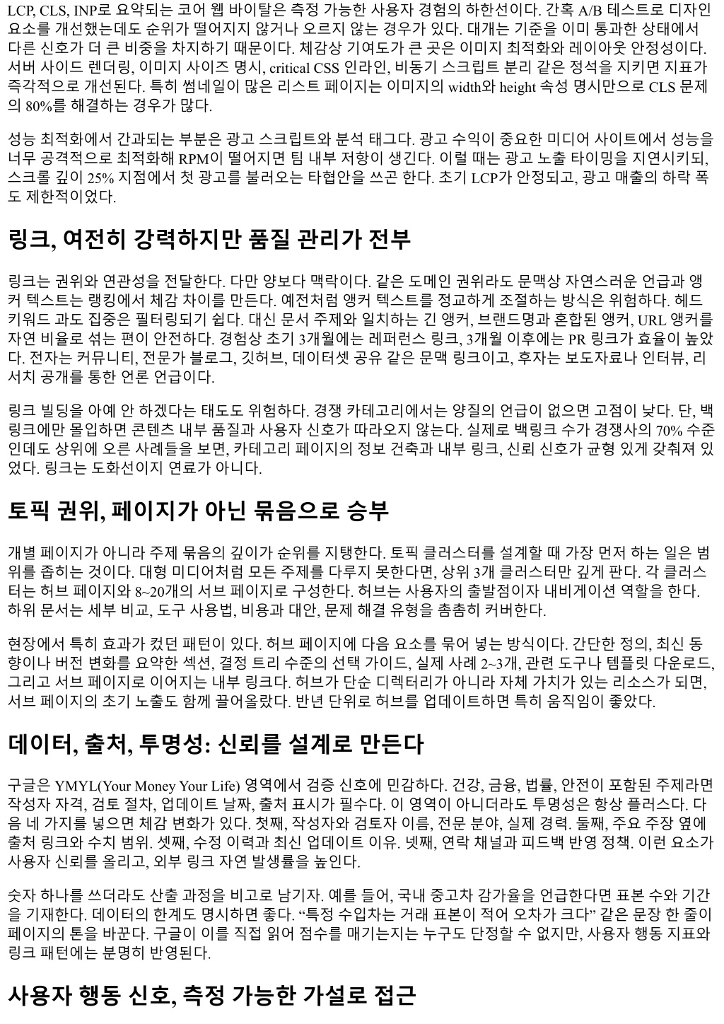 LCP, CLS, INP로요약되는코어웹바이탈은측정가능한사용자경험의하한선이다. 간혹 A/B 테스트로디자인 요소를개선했는데도순위가떨어지지않거나오르지않는경우가있다. 대개는기준을이미통과한상태에서 다른신호가더큰비중을차지하기때문이다. 체감상기여도가큰곳은이미지최적화와레이아웃안정성이다. 서버사이드렌더링, 이미지사이즈명시, critical CSS 인라인, 비동기스크립트분리같은정석을지키면지표가 즉각적으로개선된다. 특히썸네일이많은리스트페이지는이미지의 width와 height 속성명시만으로 CLS 문제 의 80%를해결하는경우가많다. 성능최적화에서간과되는부분은광고스크립트와분석태그다. 광고수익이중요한미디어사이트에서성능을 너무공격적으로최적화해 RPM이떨어지면팀내부저항이생긴다. 이럴때는광고노출타이밍을지연시키되, 스크롤깊이 25% 지점에서첫광고를불러오는타협안을쓰곤한다. 초기 LCP가안정되고, 광고매출의하락폭 도제한적이었다. 링크, 여전히강력하지만품질관리가전부 링크는권위와연관성을전달한다. 다만양보다맥락이다. 같은도메인권위라도문맥상자연스러운언급과앵 커텍스트는랭킹에서체감차이를만든다. 예전처럼앵커텍스트를정교하게조절하는방식은위험하다. 헤드 키워드과도집중은필터링되기쉽다. 대신문서주제와일치하는긴앵커, 브랜드명과혼합된앵커, URL 앵커를 자연비율로섞는편이안전하다. 경험상초기 3개월에는레퍼런스링크, 3개월이후에는 PR 링크가효율이높았 다. 전자는커뮤니티, 전문가블로그, 깃허브, 데이터셋공유같은문맥링크이고, 후자는보도자료나인터뷰, 리 서치공개를통한언론언급이다. 링크빌딩을아예안하겠다는태도도위험하다. 경쟁카테고리에서는양질의언급이없으면고점이낮다. 단, 백 링크에만몰입하면콘텐츠내부품질과사용자신호가따라오지않는다. 실제로백링크수가경쟁사의 70% 수준 인데도상위에오른사례들을보면, 카테고리페이지의정보건축과내부링크, 신뢰신호가균형있게갖춰져있 었다. 링크는도화선이지연료가아니다. 토픽권위, 페이지가아닌묶음으로승부 개별페이지가아니라주제묶음의깊이가순위를지탱한다. 토픽클러스터를설계할때가장먼저하는일은범 위를좁히는것이다. 대형미디어처럼모든주제를다루지못한다면, 상위 3개클러스터만깊게판다. 각클러스 터는허브페이지와 8~20개의서브페이지로구성한다. 허브는사용자의출발점이자내비게이션역할을한다. 하위문서는세부비교, 도구사용법, 비용과대안, 문제해결유형을촘촘히커버한다. 현장에서특히효과가컸던패턴이있다. 허브페이지에다음요소를묶어넣는방식이다. 간단한정의, 최신동 향이나버전변화를요약한섹션, 결정트리수준의선택가이드, 실제사례 2~3개, 관련도구나템플릿다운로드, 그리고서브페이지로이어지는내부링크다. 허브가단순디렉터리가아니라자체가치가있는리소스가되면, 서브페이지의초기노출도함께끌어올랐다. 반년단위로허브를업데이트하면특히움직임이좋았다. 데이터, 출처, 투명성: 신뢰를설계로만든다 구글은 YMYL(Your Money Your Life) 영역에서검증신호에민감하다. 건강, 금융, 법률, 안전이포함된주제라면 작성자자격, 검토절차, 업데이트날짜, 출처표시가필수다. 이영역이아니더라도투명성은항상플러스다. 다 음네가지를넣으면체감변화가있다. 첫째, 작성자와검토자이름, 전문분야, 실제경력. 둘째, 주요주장옆에 출처링크와수치범위. 셋째, 수정이력과최신업데이트이유. 넷째, 연락채널과피드백반영정책. 이런요소가 사용자신뢰를올리고, 외부링크자연발생률을높인다. 숫자하나를쓰더라도산출과정을비고로남기자. 예를들어, 국내중고차감가율을언급한다면표본수와기간 을기재한다. 데이터의한계도명시하면좋다. “특정수입차는거래표본이적어오차가크다” 같은문장한줄이 페이지의톤을바꾼다. 구글이이를직접읽어점수를매기는지는누구도단정할수없지만, 사용자행동지표와 링크패턴에는분명히반영된다. 사용자행동신호, 측정가능한가설로접근