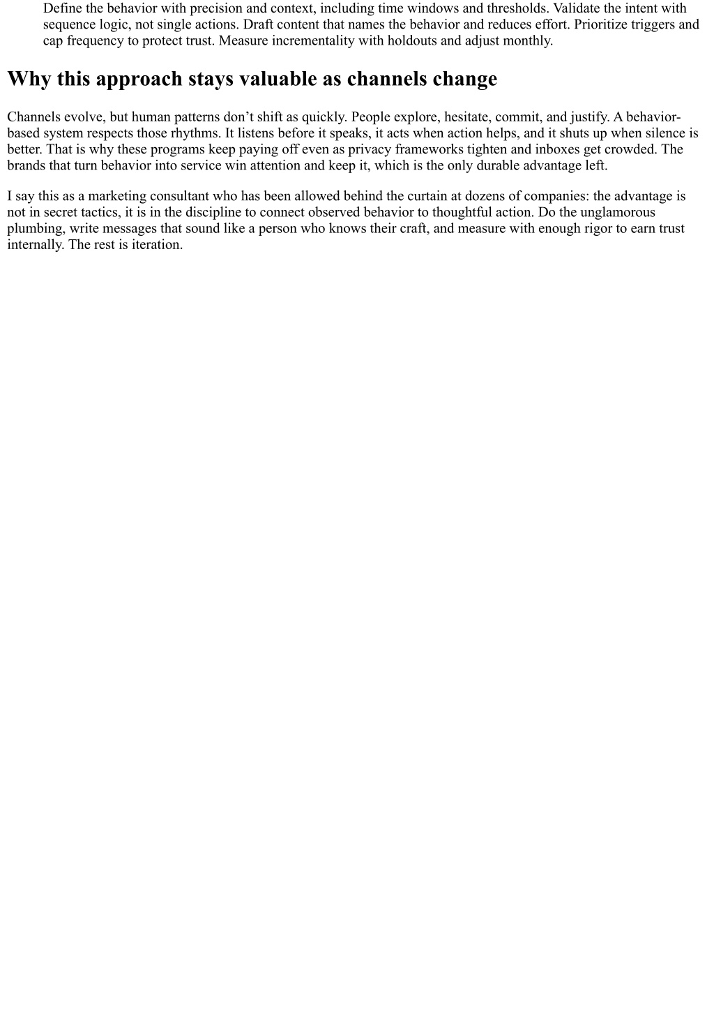 Define the behavior with precision and context, including time windows and thresholds. Validate the intent with sequence logic, not single actions. Draft content that names the behavior and reduces effort. Prioritize triggers and cap frequency to protect trust. Measure incrementality with holdouts and adjust monthly. Why this approach stays valuable as channels change Channels evolve, but human patterns don’t shift as quickly. People explore, hesitate, commit, and justify. A behavior- based system respects those rhythms. It listens before it speaks, it acts when action helps, and it shuts up when silence is better. That is why these programs keep paying off even as privacy frameworks tighten and inboxes get crowded. The brands that turn behavior into service win attention and keep it, which is the only durable advantage left. I say this as a marketing consultant who has been allowed behind the curtain at dozens of companies: the advantage is not in secret tactics, it is in the discipline to connect observed behavior to thoughtful action. Do the unglamorous plumbing, write messages that sound like a person who knows their craft, and measure with enough rigor to earn trust internally. The rest is iteration.