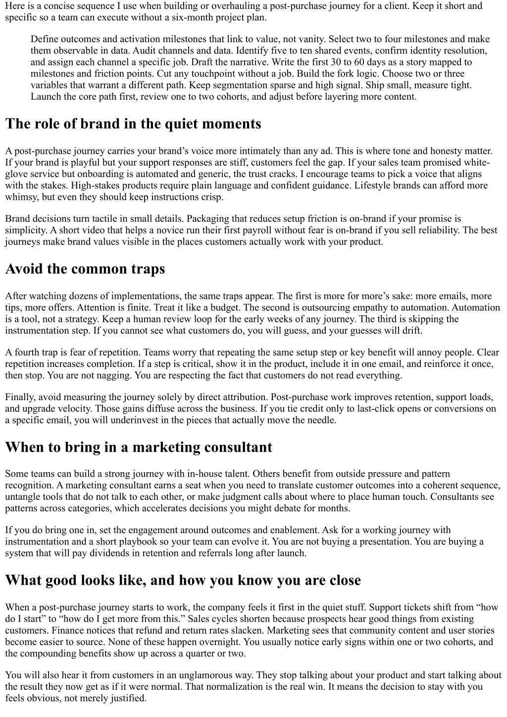 Here is a concise sequence I use when building or overhauling a post-purchase journey for a client. Keep it short and specific so a team can execute without a six-month project plan. Define outcomes and activation milestones that link to value, not vanity. Select two to four milestones and make them observable in data. Audit channels and data. Identify five to ten shared events, confirm identity resolution, and assign each channel a specific job. Draft the narrative. Write the first 30 to 60 days as a story mapped to milestones and friction points. Cut any touchpoint without a job. Build the fork logic. Choose two or three variables that warrant a different path. Keep segmentation sparse and high signal. Ship small, measure tight. Launch the core path first, review one to two cohorts, and adjust before layering more content. The role of brand in the quiet moments A post-purchase journey carries your brand’s voice more intimately than any ad. This is where tone and honesty matter. If your brand is playful but your support responses are stiff, customers feel the gap. If your sales team promised white- glove service but onboarding is automated and generic, the trust cracks. I encourage teams to pick a voice that aligns with the stakes. High-stakes products require plain language and confident guidance. Lifestyle brands can afford more whimsy, but even they should keep instructions crisp. Brand decisions turn tactile in small details. Packaging that reduces setup friction is on-brand if your promise is simplicity. A short video that helps a novice run their first payroll without fear is on-brand if you sell reliability. The best journeys make brand values visible in the places customers actually work with your product. Avoid the common traps After watching dozens of implementations, the same traps appear. The first is more for more’s sake: more emails, more tips, more offers. Attention is finite. Treat it like a budget. The second is outsourcing empathy to automation. Automation is a tool, not a strategy. Keep a human review loop for the early weeks of any journey. The third is skipping the instrumentation step. If you cannot see what customers do, you will guess, and your guesses will drift. A fourth trap is fear of repetition. Teams worry that repeating the same setup step or key benefit will annoy people. Clear repetition increases completion. If a step is critical, show it in the product, include it in one email, and reinforce it once, then stop. You are not nagging. You are respecting the fact that customers do not read everything. Finally, avoid measuring the journey solely by direct attribution. Post-purchase work improves retention, support loads, and upgrade velocity. Those gains diffuse across the business. If you tie credit only to last-click opens or conversions on a specific email, you will underinvest in the pieces that actually move the needle. When to bring in a marketing consultant Some teams can build a strong journey with in-house talent. Others benefit from outside pressure and pattern recognition. A marketing consultant earns a seat when you need to translate customer outcomes into a coherent sequence, untangle tools that do not talk to each other, or make judgment calls about where to place human touch. Consultants see patterns across categories, which accelerates decisions you might debate for months. If you do bring one in, set the engagement around outcomes and enablement. Ask for a working journey with instrumentation and a short playbook so your team can evolve it. You are not buying a presentation. You are buying a system that will pay dividends in retention and referrals long after launch. What good looks like, and how you know you are close When a post-purchase journey starts to work, the company feels it first in the quiet stuff. Support tickets shift from “how do I start” to “how do I get more from this.” Sales cycles shorten because prospects hear good things from existing customers. Finance notices that refund and return rates slacken. Marketing sees that community content and user stories become easier to source. None of these happen overnight. You usually notice early signs within one or two cohorts, and the compounding benefits show up across a quarter or two. You will also hear it from customers in an unglamorous way. They stop talking about your product and start talking about the result they now get as if it were normal. That normalization is the real win. It means the decision to stay with you feels obvious, not merely justified.