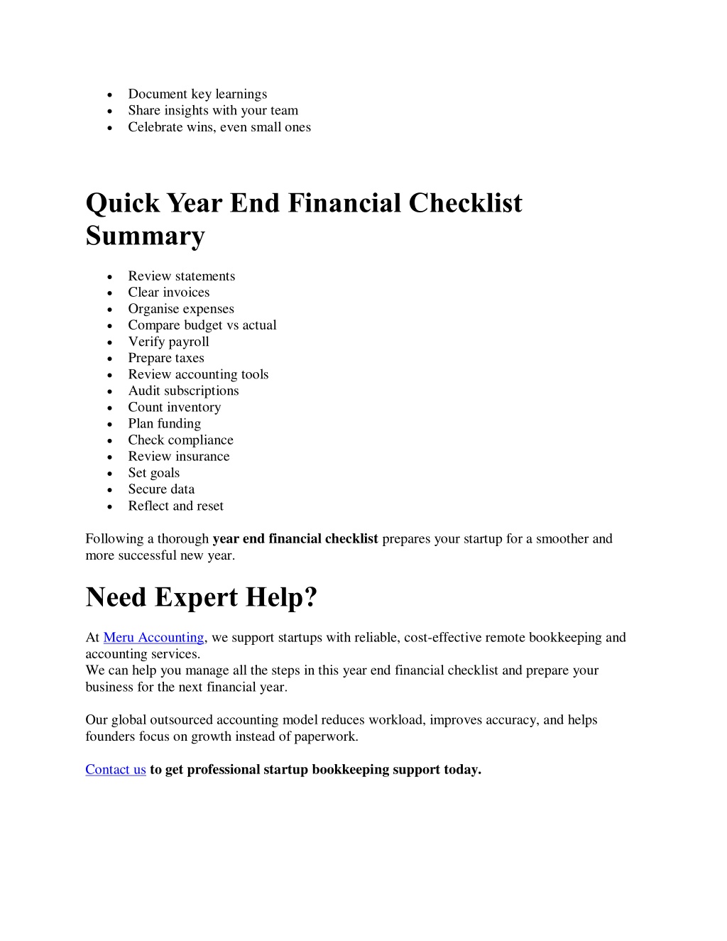 Document key learnings Share insights with your team Celebrate wins, even small ones Quick Year End Financial Checklist Summary Review statements Clear invoices Organise expenses Compare budget vs actual Verify payroll Prepare taxes Review accounting tools Audit subscriptions Count inventory Plan funding Check compliance Review insurance Set goals Secure data Reflect and reset Following a thorough year end financial checklist prepares your startup for a smoother and more successful new year. Need Expert Help? At Meru Accounting, we support startups with reliable, cost-effective remote bookkeeping and accounting services. We can help you manage all the steps in this year end financial checklist and prepare your business for the next financial year. Our global outsourced accounting model reduces workload, improves accuracy, and helps founders focus on growth instead of paperwork. Contact us to get professional startup bookkeeping support today.