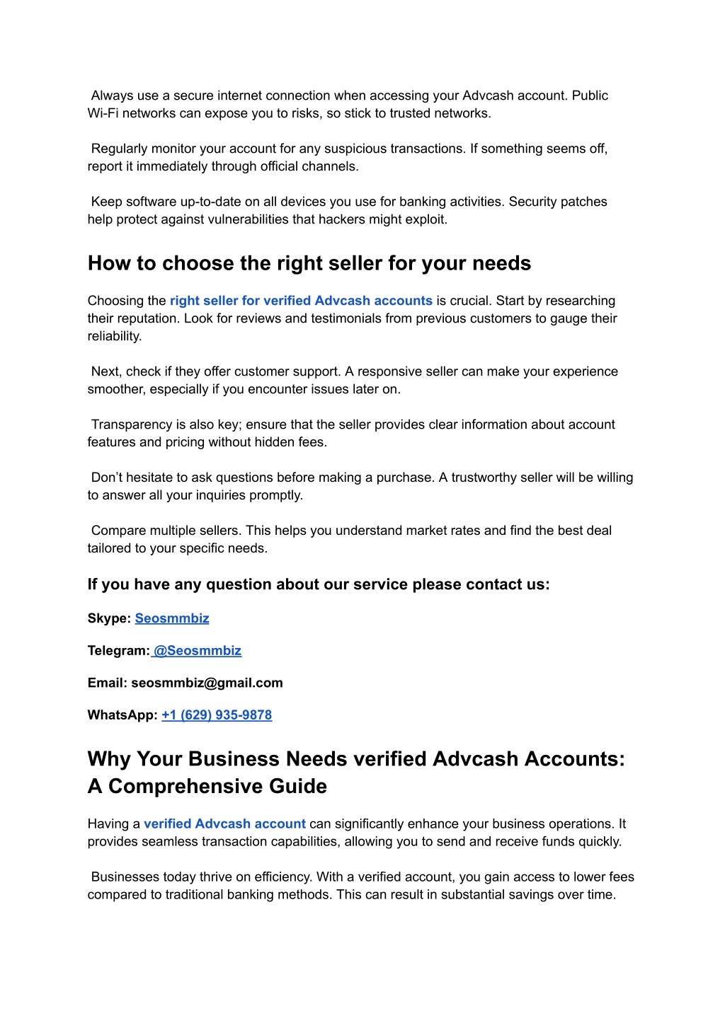seller. This often includes cryptocurrencies or other reliable payment platforms. Once you receive the account credentials, take immediate steps to secure your new asset—change passwords and enable two-factor authentication when possible. Always keep track of your transactions for future reference as well. Features of a verified Advcash account A verified Advcash account comes with several features that enhance usability and security. First, it provides a higher transaction limit, allowing users to send or receive larger amounts without restrictions. Another key feature is enhanced account protection. Verified accounts benefit from additional layers of security, reducing the risk of fraud or unauthorized access. This makes them ideal for both personal and business transactions. Users also gain access to priority customer support. Should any issues arise, having a verified status ensures quicker resolutions and dedicated assistance. Additionally, verified accounts often enjoy faster transaction processing times. This efficiency can be crucial for businesses that rely on timely payments and transfers. The credibility associated with a verified Advcash account builds trust among clients and partners alike, making it easier to establish relationships in digital commerce. If you have any question about our service please contact us: Skype: Seosmmbiz Telegram: @Seosmmbiz Email: seosmmbiz@gmail.com WhatsApp: +1 (629) 935-9878 Tips for using Advcash safely and securely When using Advcash, security should always be a top priority. Start by enabling two-factor authentication on your account. This adds an extra layer of protection against unauthorized access. Be cautious with the information you share online. Never disclose your password or personal details to anyone, even if they claim to represent Advcash. Phishing attempts are common and can compromise your account.