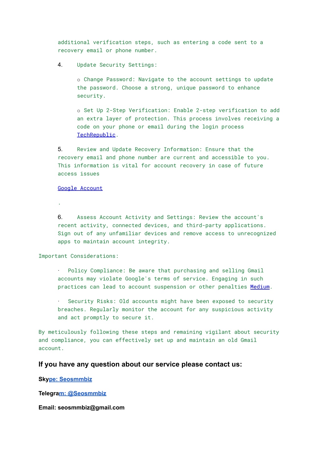 additional verification steps, such as entering a code sent to a recovery email or phone number. Update Security Settings: 4. o Change Password: Navigate to the account settings to update the password. Choose a strong, unique password to enhance security. o Set Up 2-Step Verification: Enable 2-step verification to add an extra layer of protection. This process involves receiving a code on your phone or email during the login process TechRepublic. Review and Update Recovery Information: Ensure that the 5. recovery email and phone number are current and accessible to you. This information is vital for account recovery in case of future access issues Google Account . Assess Account Activity and Settings: Review the account's 6. recent activity, connected devices, and third-party applications. Sign out of any unfamiliar devices and remove access to unrecognized apps to maintain account integrity. Important Considerations: Policy Compliance: Be aware that purchasing and selling Gmail · accounts may violate Google's terms of service. Engaging in such practices can lead to account suspension or other penalties Medium. Security Risks: Old accounts might have been exposed to security · breaches. Regularly monitor the account for any suspicious activity and act promptly to secure it. By meticulously following these steps and remaining vigilant about security and compliance, you can effectively set up and maintain an old Gmail account. If you have any question about our service please contact us: Skype: Seosmmbiz Telegram: @Seosmmbiz Email: seosmmbiz@gmail.com