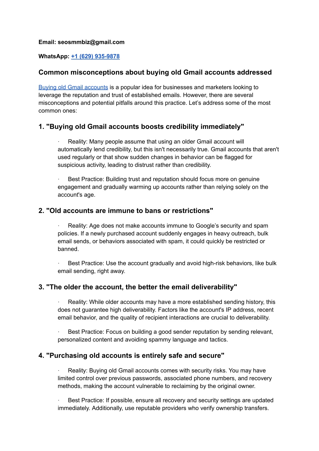 5. "Old Gmail accounts won’t raise red flags in Google’s security systems" Reality: Google’s algorithms can detect unusual activity patterns, such as login · attempts from new locations, changes in IP addresses, or sudden high-volume usage. These patterns could trigger security verifications or restrictions. Best Practice: Ease into account usage with lower activity levels initially, and if · possible, use the account from a location similar to the original user’s login history. 6. "You’ll have access to all original data and settings" Reality: Sometimes, data within old accounts may have been deleted or · inaccessible. Google may also lock down certain features temporarily when it detects ownership changes. Best Practice: Assume that data may not be reliable or complete. Instead, view · the account’s age as an asset in name only and be prepared to build new data and history over time. 7. "Old Gmail accounts are affordable and give an instant ROI" Reality: While there can be a strategic advantage to using an older account, · they’re often more expensive, especially verified ones. And, the ROI is not always instant, especially if the account needs to be “warmed up” or used cautiously. Best Practice: Consider the costs carefully and weigh them against the potential · benefits. Sometimes, building a fresh account with best practices can achieve similar results in the long term. 8. "Using an old Gmail account bypasses email marketing compliance issues" Reality: Compliance with email marketing regulations, like CAN-SPAM in the U.S. · and GDPR in Europe, doesn’t change with the age of the email account. An old account isn’t immune from penalties related to spam or privacy violations. Best Practice: Follow all applicable email marketing regulations and maintain a · clear opt-in record of subscribers, regardless of account age. Summary While buying old Gmail accounts can provide certain advantages, like established domain presence, it’s important to approach it cautiously and strategically. Treat the account as an asset that needs to be nurtured, warmed up, and carefully managed to avoid security risks, deliverability issues, and compliance pitfalls. If you have any question about our service please contact us: