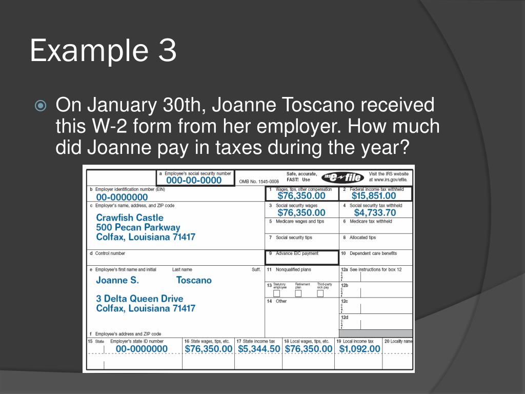 Example 3 • On January 30th, Joanne Toscano received this W-2 form from her employer. How much did Joanne pay in taxes during the year?