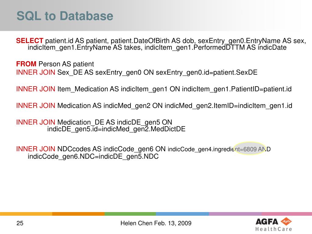 SQL to Database SELECT patient.id AS patient, patient.DateOfBirth AS dob, sexEntry_gen0.EntryName AS sex, indicItem_gen1.EntryName AS takes, indicItem_gen1.PerformedDTTM AS indicDate FROM Person AS patient INNER JOIN Sex_DE AS sexEntry_gen0 ON sexEntry_gen0.id=patient.SexDE INNER JOIN Item_Medication AS indicItem_gen1 ON indicItem_gen1.PatientID=patient.id INNER JOIN Medication AS indicMed_gen2 ON indicMed_gen2.ItemID=indicItem_gen1.id INNER JOIN Medication_DE AS indicDE_gen5 ON indicDE_gen5.id=indicMed_gen2.MedDictDE INNER JOIN NDCcodes AS indicCode_gen6 ON indicCode_gen4.ingredient=6809 ANDindicCode_gen6.NDC=indicDE_gen5.NDC