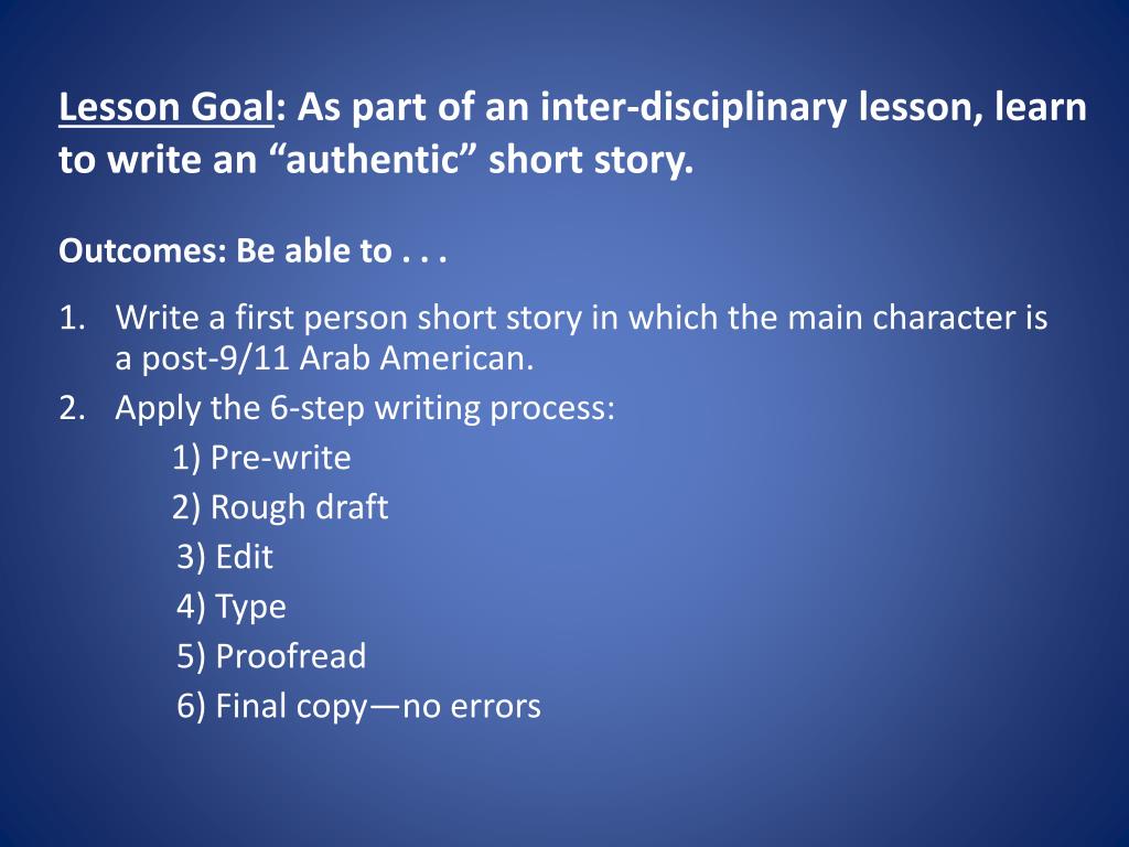 Lesson Goal: As part of an inter-disciplinary lesson, learn to write an “authentic” short story. Outcomes: Be able to . . . Write a first person short story in which the main character is a post-9/11 Arab American. Applythe 6-step writing process: 1) Pre-write 2) Rough draft 3) Edit 4) Type 5) Proofread 6) Final copy—no errors