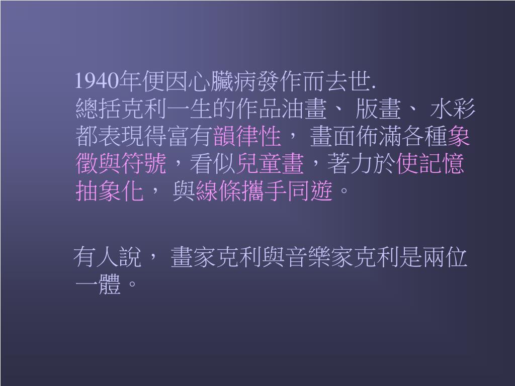 1940年便因心臟病發作而去世. 總括克利一生的作品油畫、 版畫、 水彩都表現得富有韻律性, 畫面佈滿各種象徵與符號,看似兒童畫,著力於使記憶抽象化, 與線條攜手同遊。 有人說, 畫家克利與音樂家克利是兩位一體。
