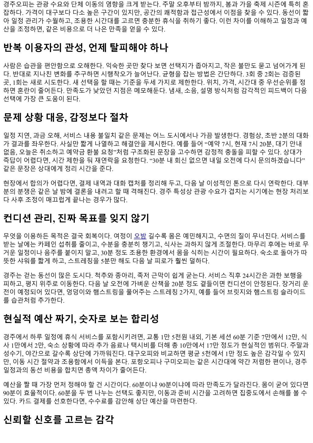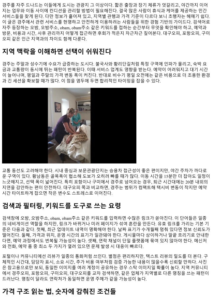 경주를자주드나드는이들에게도시는관광지그이상이다. 짧은출장과장기체류가엇갈리고, 야간까지이어 지는업무와이동사이에컨디션을관리할방법이필요해진다. 결국많은사람이휴식과케어를제공하는민간 서비스들을찾게된다. 다만정보가흩어져있고, 지역별관행과가격기준이다르다보니초행자는헤매기쉽다. 이글은경주에서관련서비스를현명하고안전하게이용하려는사람들을위한경험기반의가이드다. 검색어로 자주등장하는오밤, 오밤주소, obam, obam주소같은키워드를접하는순간부터무엇을확인해야하고, 예약과 방문, 비용과시간, 사후관리까지어떻게접근하면후회가적은지차근차근짚어본다. 대구오피, 포항오피, 구미 오피같은인근지역과의차이도함께다룬다. 지역맥락을이해하면선택이쉬워진다 경주는주말과성수기에수요가급증하는도시다. 불국사와황리단길처럼특정구역에인파가몰리고, 숙박요 금과교통량이동시에뛰는패턴이반복된다. 이때서비스업계도영향을받는다. 예약이어려워지고대기시간 이늘어나며, 평일과주말의가격변동폭이커진다. 반대로비수기평일오전에는같은비용으로더조용한환경 과긴세션을확보할때가많다. 이점을염두에두면합리적인타이밍을잡을수있다. 교통동선도고려해야한다. 시내중심과보문관광단지는승용차접근성이좋은편이지만, 야간주차가까다로 운구역이있다. 황남동은골목폭이협소해도보가오히려빠를때가많다. 이동시간을 15분만더잡아도일정이 느긋해지고, 선택폭이넓어진다. 특히포항이나구미에서경주로넘어오는경우, 퇴근시간대에는 20분내외의 지연을감안하는편이안전하다. 대구오피쪽과비교하면, 경주는범위가컴팩트해택시비변동이작지만예약 시간타이트하게잡으면작은변수도스트레스로이어진다. 검색과필터링, 키워드를도구로쓰는요령 검색창에오밤, 오밤주소, obam, obam주소같은키워드를입력하면수많은링크가쏟아진다. 이단어들은일종 의네비게이션역할을하지만, 링크가바뀌거나미러페이지가섞여혼란을만든다. 유효링크를가리는기본기 준은다음과같다. 첫째, 최근업데이트내역이명확해야한다. 날짜표기가수개월째멈춰있다면정보신뢰도가 떨어진다. 둘째, 가격과위치, 운영시간의표기가일관돼야한다. 게시물마다상이하거나말끝흐리기로안내한 다면, 예약과정에서도번복될가능성이높다. 셋째, 연락채널이단일플랫폼에묶여있지않아야한다. 메신저 와전화, 예약폼중최소두가지가열려있으면문제발생시대응이빠르다. 포털이나커뮤니티에선리뷰가일종의통화처럼쓰인다. 별점은편리하지만, 텍스트리뷰의밀도를더본다. 구 체적인시간대, 담당자표시, 소요시간, 추가비용여부처럼검증가능한내용이많을수록신뢰할만하다. 사진 은참고용으로만보되, 동일한이미지를여러계정이공유하는경우스탁이미지일확률이높다. 지역커뮤니티 에서경주오피, 포항오피, 구미오피, 대구오피를교차검색하면, 같은업체가지역별로다른명칭을쓰는패턴이 드러난다. 명칭이달라도연락처가동일하면운영주체가같을가능성이높다. 가격구조읽는법, 숫자에감춰진조건들