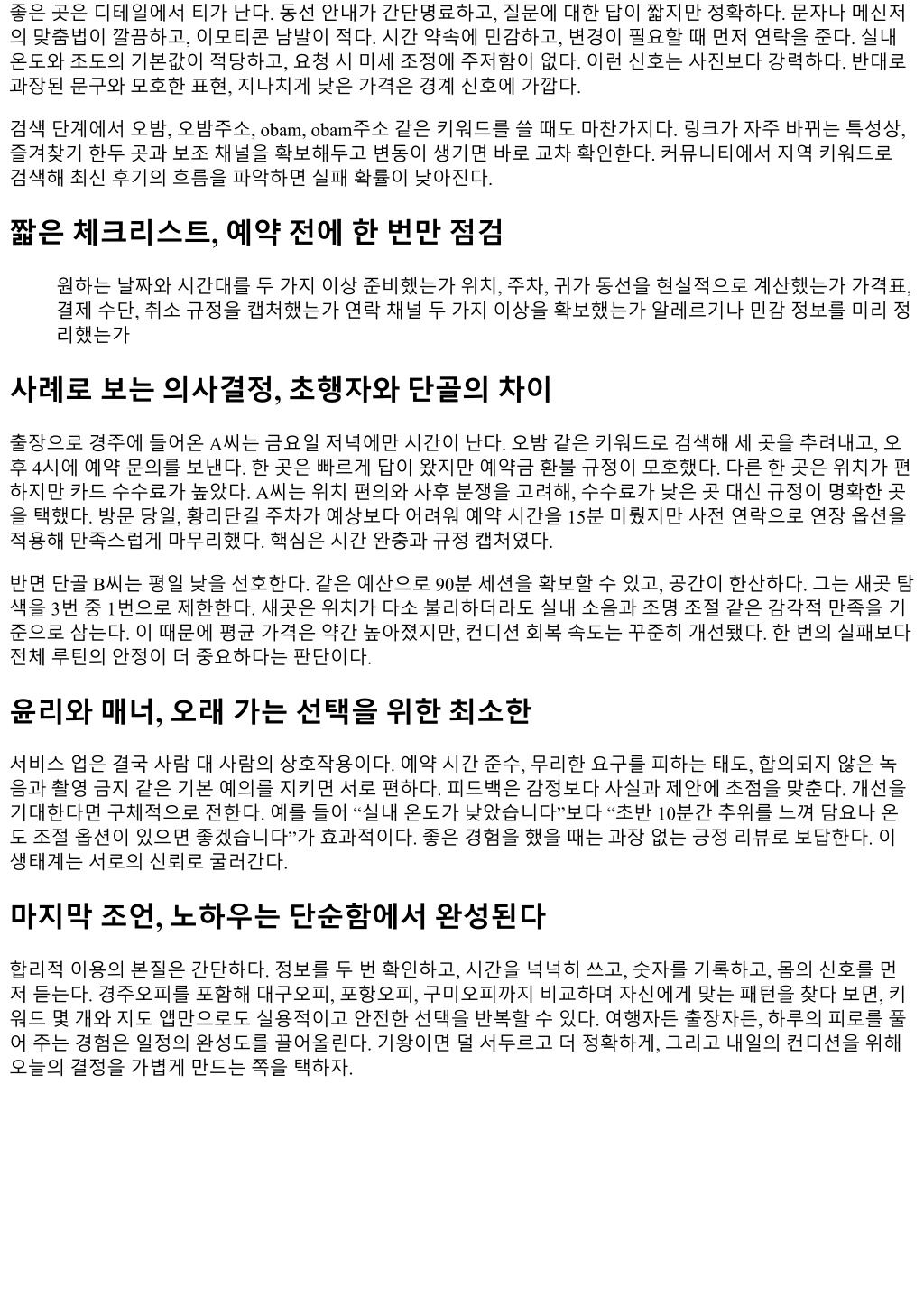 좋은곳은디테일에서티가난다. 동선안내가간단명료하고, 질문에대한답이짧지만정확하다. 문자나메신저 의맞춤법이깔끔하고, 이모티콘남발이적다. 시간약속에민감하고, 변경이필요할때먼저연락을준다. 실내 온도와조도의기본값이적당하고, 요청시미세조정에주저함이없다. 이런신호는사진보다강력하다. 반대로 과장된문구와모호한표현, 지나치게낮은가격은경계신호에가깝다. 검색단계에서오밤, 오밤주소, obam, obam주소같은키워드를쓸때도마찬가지다. 링크가자주바뀌는특성상, 즐겨찾기한두곳과보조채널을확보해두고변동이생기면바로교차확인한다. 커뮤니티에서지역키워드로 검색해최신후기의흐름을파악하면실패확률이낮아진다. 짧은체크리스트, 예약전에한번만점검 원하는날짜와시간대를두가지이상준비했는가위치, 주차, 귀가동선을현실적으로계산했는가가격표, 결제수단, 취소규정을캡처했는가연락채널두가지이상을확보했는가알레르기나민감정보를미리정 리했는가 사례로보는의사결정, 초행자와단골의차이 출장으로경주에들어온 A씨는금요일저녁에만시간이난다. 오밤같은키워드로검색해세곳을추려내고, 오 후 4시에예약문의를보낸다. 한곳은빠르게답이왔지만예약금환불규정이모호했다. 다른한곳은위치가편 하지만카드수수료가높았다. A씨는위치편의와사후분쟁을고려해, 수수료가낮은곳대신규정이명확한곳 을택했다. 방문당일, 황리단길주차가예상보다어려워예약시간을 15분미뤘지만사전연락으로연장옵션을 적용해만족스럽게마무리했다. 핵심은시간완충과규정캡처였다. 반면단골 B씨는평일낮을선호한다. 같은예산으로 90분세션을확보할수있고, 공간이한산하다. 그는새곳탐 색을 3번중 1번으로제한한다. 새곳은위치가다소불리하더라도실내소음과조명조절같은감각적만족을기 준으로삼는다. 이때문에평균가격은약간높아졌지만, 컨디션회복속도는꾸준히개선됐다. 한번의실패보다 전체루틴의안정이더중요하다는판단이다. 윤리와매너, 오래가는선택을위한최소한 서비스업은결국사람대사람의상호작용이다. 예약시간준수, 무리한요구를피하는태도, 합의되지않은녹 음과촬영금지같은기본예의를지키면서로편하다. 피드백은감정보다사실과제안에초점을맞춘다. 개선을 기대한다면구체적으로전한다. 예를들어 “실내온도가낮았습니다”보다 “초반 10분간추위를느껴담요나온 도조절옵션이있으면좋겠습니다”가효과적이다. 좋은경험을했을때는과장없는긍정리뷰로보답한다. 이 생태계는서로의신뢰로굴러간다. 마지막조언, 노하우는단순함에서완성된다 합리적이용의본질은간단하다. 정보를두번확인하고, 시간을넉넉히쓰고, 숫자를기록하고, 몸의신호를먼 저듣는다. 경주오피를포함해대구오피, 포항오피, 구미오피까지비교하며자신에게맞는패턴을찾다보면, 키 워드몇개와지도앱만으로도실용적이고안전한선택을반복할수있다. 여행자든출장자든, 하루의피로를풀 어주는경험은일정의완성도를끌어올린다. 기왕이면덜서두르고더정확하게, 그리고내일의컨디션을위해 오늘의결정을가볍게만드는쪽을택하자.