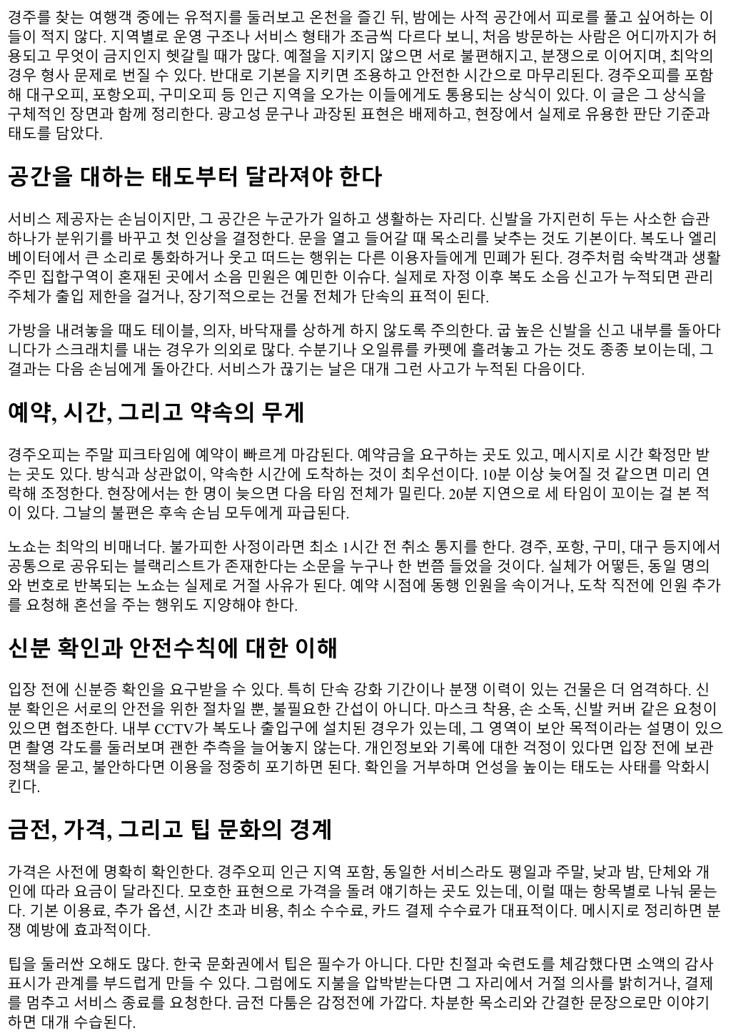 대화법이분위기를좌우한다 처음부터반말을하는손님은흔히방어적태도를유발한다. 존중은존댓말에서시작한다. 원하는바가있다면 질문형태로차분히제시한다. 불편한점이있을때도마찬가지다. 단정적으로 “이건원래이렇게해줘야하는 것아닌가요”라고몰아붙이는말투는협상여지를줄이고반감을키운다. 반대로 “가능한범위를알려주시면그 안에서선택하겠습니다”라고말하면안전선이명확해진다. 부적절한요구는그자리에서중단하자. 일정범위를넘어서는요청에대한거절은직원의권리다. 강요하거나, 분위기를압박으로몰고가면상담종료대상이된다. “안되는건왜안되느냐”보다 “허용되는범위가어디까지 냐”를묻는방식이현명하다. 단정한복장과청결이만드는신뢰 경주처럼관광과업무여행이뒤섞인도시에서는다양한차림의손님이오간다. 중요한건과도하게노출되거 나, 악취를유발하는복장을피하는일이다. 샤워는요청이없어도먼저제안하는편이좋다. 체취가강하면공간 전체가불편해지고, 예기치않은민원이발생한다. 향수는과하게뿌리지않는다. 은은한비누향정도가가장안 전하다. 손톱관리도소소하지만중요한항목이다. 길고날카로운손톱은상처와사고의원인이된다. 액세서리는금속 소음을내고, 민감한표면을긁는다. 입구에제공되는보관함이나파우치를활용하자. 현장에서분실신고가많 은품목이반지와이어폰케이스다. 작은주의로번거로움을줄일수있다. 사진, 녹음, 후기작성의윤리 사전동의없는촬영과녹음은금지다. 내부디테일을찍어온라인커뮤니티에올리면, 당장조회수는얻을지몰 라도, 장기적으로는공간의생존이어렵다. 후기를남길때도특정인물식별이가능한단서나내부구조를드러 내는묘사를피한다. 오밤, 오밤주소, obam, obam주소같은사이트나커뮤니티에경험담을공유할때도마찬가 지다. 정보가불친절해보일수있지만, 과도한노출이초래하는단속과분쟁을생각하면균형감이필요하다. 후기에는정확성과공정성을우선한다. 감정이격한상태에서밤에쓴글은다음날오전에보면표현이과했다 는걸깨닫게된다. 시간을두고정리하는습관이모두를보호한다. 사실관계를분리하고, 객관적요소부터서술 한뒤, 개인적호불호를덧붙인다. 가격과시간, 예약과정, 현장응대같은체크포인트는객관화하기쉬운항목 이다. 음주, 약물, 흡연에대한단호한기준 과음상태에서의방문은거절된다. 술은자신감과충동을동시에키운다. 말이길어지고통제가어려워지면작 은오해도큰충돌로비화한다. 약물은더엄격하다. 의사처방을받지않은약물의소지는불법이고, 복용후이 용은위험하다. 이건예절이전의문제다. 얼마나친절한곳이라도, 그런상황을감수하지않는다. 흡연은지정된장소에서만한다. 베란다, 화장실흡연으로경고를받은뒤에도반복하면강제퇴실조치가이뤄 진다. 요즘은냄새차단장치가있어도이웃신고가더빠르다. 경주인근원룸형건물밀집구역에서는한번의 신고가다음주대대적단속으로이어진적이있다. 본인의흡연한개비가전체업소의일주일을날릴수있다. 경계선이필요한요구와합의의기술 요청이가능한것과불가능한것을구분하는가장확실한방법은, 초반안내에서범위를직접확인하는일이다. 메뉴가모호하면항목별로재차묻는다. 추가비용이발생하는옵션이라면금액과시간을객관적으로기록한다. 말보다문자로남기는이유는증거때문이아니다. 사람은대화에서디테일을놓치기쉽기때문이다. 합의가어긋났다고느낄때, 그자리에서즉시문제를제기하되, 목소리를낮게유지한다. 고성이오가면양쪽모 두퇴로를잃는다. 한번격해진대화는되돌리기어렵다. 필요한경우, 관리주체나중간담당자를호출해상황