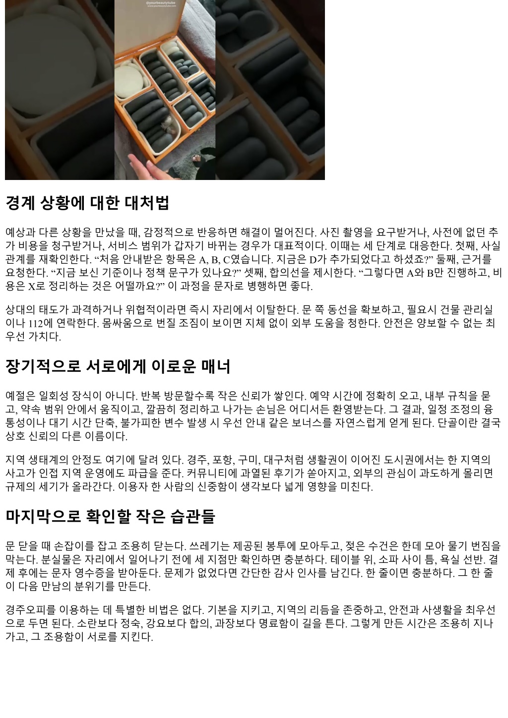 경계상황에대한대처법 예상과다른상황을만났을때, 감정적으로반응하면해결이멀어진다. 사진촬영을요구받거나, 사전에없던추 가비용을청구받거나, 서비스범위가갑자기바뀌는경우가대표적이다. 이때는세단계로대응한다. 첫째, 사실 관계를재확인한다. “처음안내받은항목은 A, B, C였습니다. 지금은 D가추가되었다고하셨죠?” 둘째, 근거를 요청한다. “지금보신기준이나정책문구가있나요?” 셋째, 합의선을제시한다. “그렇다면 A와 B만진행하고, 비 용은 X로정리하는것은어떨까요?” 이과정을문자로병행하면좋다. 상대의태도가과격하거나위협적이라면즉시자리에서이탈한다. 문쪽동선을확보하고, 필요시건물관리실 이나 112에연락한다. 몸싸움으로번질조짐이보이면지체없이외부도움을청한다. 안전은양보할수없는최 우선가치다. 장기적으로서로에게이로운매너 예절은일회성장식이아니다. 반복방문할수록작은신뢰가쌓인다. 예약시간에정확히오고, 내부규칙을묻 고, 약속범위안에서움직이고, 깔끔히정리하고나가는손님은어디서든환영받는다. 그결과, 일정조정의융 통성이나대기시간단축, 불가피한변수발생시우선안내같은보너스를자연스럽게얻게된다. 단골이란결국 상호신뢰의다른이름이다. 지역생태계의안정도여기에달려있다. 경주, 포항, 구미, 대구처럼생활권이이어진도시권에서는한지역의 사고가인접지역운영에도파급을준다. 커뮤니티에과열된후기가쏟아지고, 외부의관심이과도하게몰리면 규제의세기가올라간다. 이용자한사람의신중함이생각보다넓게영향을미친다. 마지막으로확인할작은습관들 문닫을때손잡이를잡고조용히닫는다. 쓰레기는제공된봉투에모아두고, 젖은수건은한데모아물기번짐을 막는다. 분실물은자리에서일어나기전에세지점만확인하면충분하다. 테이블위, 소파사이틈, 욕실선반. 결 제후에는문자영수증을받아둔다. 문제가없었다면간단한감사인사를남긴다. 한줄이면충분하다. 그한줄 이다음만남의분위기를만든다. 경주오피를이용하는데특별한비법은없다. 기본을지키고, 지역의리듬을존중하고, 안전과사생활을최우선 으로두면된다. 소란보다정숙, 강요보다합의, 과장보다명료함이길을튼다. 그렇게만든시간은조용히지나 가고, 그조용함이서로를지킨다.