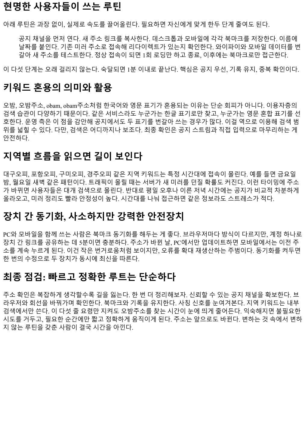 현명한사용자들이쓰는루틴 아래루틴은과장없이, 실제로속도를끌어올린다. 필요하면자신에게맞게한두단계줄여도된다. 공지채널을먼저연다. 새주소링크를복사한다. 데스크톱과모바일에각각북마크를저장한다. 이름에 날짜를붙인다. 기존미러주소로접속해리다이렉트가있는지확인한다. 와이파이와모바일데이터를번 갈아새주소를테스트한다. 정상접속이되면 1회로딩만하고종료, 이후에는북마크로만접근한다. 이다섯단계는오래걸리지않는다. 숙달되면 1분이내로끝난다. 핵심은공지우선, 기록유지, 중복확인이다. 키워드혼용의의미와활용 오밤, 오밤주소, obam, obam주소처럼한국어와영문표기가혼용되는이유는단순회피가아니다. 이용자층의 검색습관이다양하기때문이다. 같은서비스라도누군가는한글표기로만찾고, 누군가는영문혼합표기를선 호한다. 운영측은이점을감안해공지에서도두표기를번갈아쓰는경우가많다. 이걸역으로이용해검색범 위를넓힐수있다. 다만, 검색은어디까지나보조다. 최종확인은공지스트림과직접입력으로마무리하는게 안전하다. 지역별흐름을읽으면길이보인다 대구오피, 포항오피, 구미오피, 경주오피같은지역키워드는특정시간대에접속이몰린다. 예를들면금요일 밤, 월요일새벽같은패턴이다. 트래픽이몰릴때는서버가새미러를던질확률도커진다. 이런타이밍에주소 가바뀌면사용자들은대개검색으로몰린다. 반대로평일오후나이른저녁시간에는공지가비교적차분하게 올라오고, 미러정리도빨라안정성이높다. 시간대를나눠접근하면같은정보라도스트레스가적다. 장치간동기화, 사소하지만강력한안전장치 PC와모바일을함께쓰는사람은북마크동기화를해두는게좋다. 브라우저마다방식이다르지만, 계정하나로 장치간링크를공유하는데 5분이면충분하다. 주소가바뀐날, PC에서만업데이트하면모바일에서는이전주 소를계속누르게된다. 이건작은번거로움처럼보이지만, 오류를확대재생산하는주범이다. 동기화를켜두면 한번의수정으로두장치가동시에최신을따른다. 최종점검: 빠르고정확한루트는단순하다 주소확인은복잡하게생각할수록길을잃는다. 한번더정리해보자. 신뢰할수있는공지채널을확보한다. 브 라우저와회선을바꿔가며확인한다. 북마크와기록을유지한다. 사칭신호를눈여겨본다. 지역키워드는내부 검색에서만쓴다. 이다섯줄요령만지켜도오밤주소를찾는시간이눈에띄게줄어든다. 익숙해지면불필요한 시도를거두고, 필요한순간에만짧고정확하게움직이게된다. 주소는앞으로도바뀐다. 변하는것속에서변하 지않는루틴을갖춘사람이결국시간을아낀다.