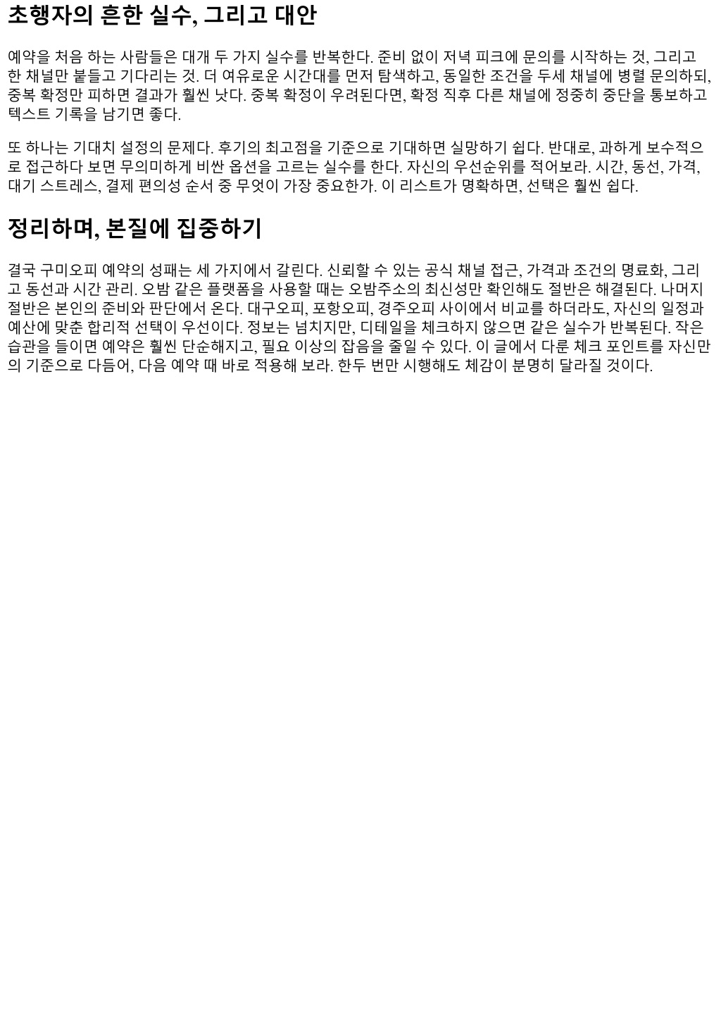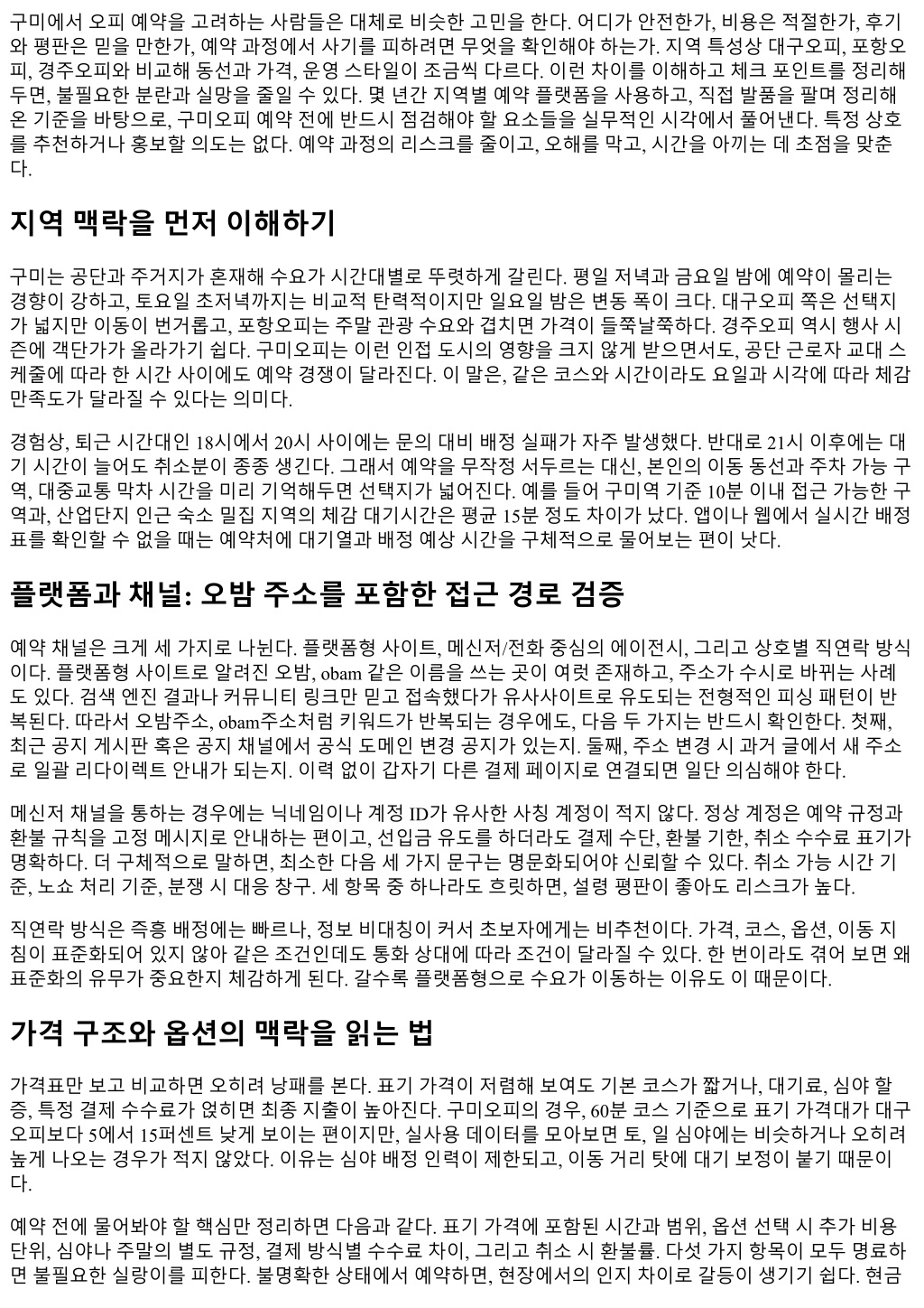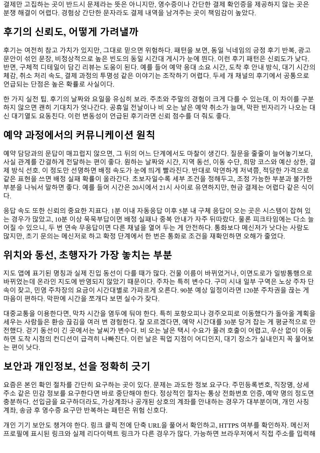 결제만고집하는곳이반드시문제라는뜻은아니지만, 영수증이나간단한결제확인증을제공하지않는곳은 분쟁해결이어렵다. 경험상간단한문자라도결제내역을남겨주는곳이책임감이높았다. 후기의신뢰도, 어떻게가려낼까 후기는여전히참고가치가있지만, 그대로믿으면위험하다. 패턴을보면, 동일닉네임의긍정후기반복, 광고 문안이섞인문장, 비정상적으로높은빈도의동일시간대게시가눈에띈다. 이런후기패턴은신뢰도가낮다. 반면, 구체적디테일이담긴리뷰는도움이된다. 예를들어예약응대소요시간, 도착후안내방식, 대기시간의 체감, 취소처리속도, 결제과정의투명성같은이야기는조작하기어렵다. 두세개채널의후기에서공통으로 언급되는단점은높은확률로사실이다. 한가지실전팁. 후기의날짜와요일을유심히보라. 주초와주말의경험이크게다를수있는데, 이차이를구분 하지않으면괜히기대치가엇나간다. 공휴일전날이나비오는날은예약취소가늘며, 막판빈자리가나오는대 신대기열도요동친다. 이런변동성이언급된후기라면신뢰점수를더줘도좋다. 예약과정에서의커뮤니케이션원칙 예약담당과의문답이매끄럽지않으면, 그뒤의어느단계에서도마찰이생긴다. 질문을줄줄이늘어놓기보다, 사실관계를간결하게전달하는편이좋다. 원하는날짜와시간, 지역동선, 이동수단, 희망코스와예산상한, 결 제방식선호. 이정도만선명하면배정속도가눈에띄게빨라진다. 반대로막연하게저녁쯤, 적당한가격으로 같은표현을쓰면배정실패확률이올라간다. 초보자일수록세부조건을정해두고, 조정가능한부분과불가한 부분을나눠서말하면좋다. 예를들어시간은 20시에서 21시사이로유연하지만, 현금결제는어렵다같은식이 다. 응답속도또한신뢰의중요한지표다. 1분이내자동응답이후 5분내구체응답이오는곳은시스템이잡혀있 는경우가많았고, 10분이상묵묵부답이면배정실패나중복안내가자주뒤따랐다. 물론피크타임에는다소늘 어질수있으니, 두번연속무응답이면다른채널을열어두는게안전하다. 통화보다메신저가낫다는사람도 많지만, 초기문의는메신저로하고확정단계에서한번은통화로조건을재확인하면오해가줄었다. 위치와동선, 초행자가가장놓치는부분 지도앱에표기된명칭과실제진입동선이다를때가많다. 건물이름이바뀌었거나, 이면도로가일방통행으로 바뀌었는데온라인지도에반영되지않았기때문이다. 주차는특히변수다. 구미시내일부구역은노상주차단 속이잦고, 민영주차장의요금이시간대별로가파르게오른다. 90분예상일정이라면 120분주차권을끊는게 마음이편하다. 막판에시간을쪼개다보면실수가잦다. 대중교통을이용한다면, 막차시간을염두에둬야한다. 특히포항오피나경주오피로이동했다가돌아올계획을 세우는사람들은환승끊김을여러번경험한다. 잘모르겠다면, 예약시간대를 30분당겨잡는게평균적으로안 전했다. 걷기동선이긴곳에서는날씨가변수다. 비오는날은택시수요가몰려호출이어렵고, 우산없이이동 하면도착시점의컨디션이급격히나빠진다. 이런날은픽업지점이어디인지, 대기장소가실내인지꼭물어보 는편이낫다. 보안과개인정보, 선을정확히긋기 요즘은본인확인절차를간단히요구하는곳이있다. 문제는과도한정보요구다. 주민등록번호, 직장명, 상세 주소같은민감정보를요구한다면바로중단해야한다. 정상적인절차는통상전화번호인증, 예약명의정도면 충분하다. 선입금을요구하더라도, 가상계좌나공개된상호의계좌를안내하는경우가대부분이며, 개인사칭 계좌, 송금후영수증요구만반복하는패턴은위험신호다. 개인기기보안도챙겨야한다. 링크클릭전에단축 URL을풀어서확인하고, HTTPS 여부를확인하자. 메신저 프로필에표시된링크와실제리다이렉트링크가다른경우가많다. 가능하면브라우저에서직접주소를입력해
