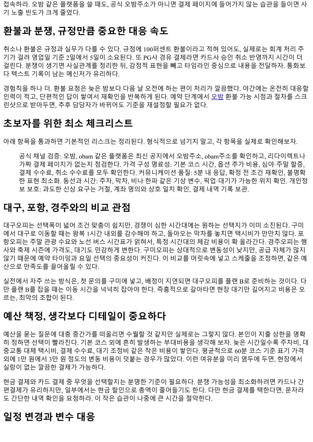 접속하라. 오밤같은플랫폼을쓸때도, 공식오밤주소가아니면결제페이지에들어가지않는습관을들이면사 기노출빈도가크게줄었다. 환불과분쟁, 규정만큼중요한대응속도 취소나환불은규정과실무가다를수있다. 규정에 100퍼센트환불이라고적혀있어도, 실제로는회계처리주 기가걸려영업일기준 2일에서 5일이소요된다. 또 PG사경유결제라면카드사승인취소반영까지시간이더 걸린다. 분쟁이생기면사실관계를정리한뒤, 감정적표현을빼고타임라인중심으로내용을전달하자. 통화보 다텍스트기록이남는메신저가유리하다. 경험칙을하나더. 환불요청은늦은밤보다다음날오전에하는편이처리가깔끔했다. 야간에는온전히대응할 인력이적고, 단편적인답이쌓여서재확인을반복하게된다. 예약단계에서오밤환불가능시점과절차를스크 린샷으로받아두면, 추후담당자가바뀌어도기준을재설정할필요가없다. 초보자를위한최소체크리스트 아래항목을통과하면기본적인리스크는정리된다. 형식적으로넘기지말고, 각항목을실제로확인해보자. 공식채널검증: 오밤, obam 같은플랫폼은최신공지에서오밤주소, obam주소를확인하고, 리다이렉트나 가짜결제페이지가없는지점검한다. 가격구성명료성: 기본코스시간, 옵션추가비용, 심야·주말할증, 결제수수료, 취소수수료를모두확인한다. 커뮤니케이션품질: 5분내응답, 확정전조건재확인, 불명확 한표현최소화. 동선과시간: 주차, 막차, 비나한파같은기상변수, 픽업·대기가가능한위치확인. 개인정 보보호: 과도한신상요구는거절, 계좌명의와상호일치확인, 결제내역기록보관. 대구, 포항, 경주와의비교관점 대구오피는선택폭이넓어조건맞춤이쉽지만, 경쟁이심한시간대에는원하는선택지가이미소진된다. 구미 에서대구로이동할때는왕복 1시간내외를감수해야하고, 돌아오는막차를놓치면택시비가만만치않다. 포 항오피는주말관광수요와노선버스시간표가얽혀서, 특정시간대의체감비용이확올라간다. 경주오피는행 사와축제시즌에가격도, 대기도민감하게변한다. 구미오피는상대적으로변동성이낮지만, 공급자체가많지 않기때문에예약타이밍과요일선택의중요성이커진다. 이비교를머릿속에넣고스케줄을조정하면, 같은예 산으로만족도를끌어올릴수있다. 실전에서자주쓰는방식은, 첫문의를구미에넣고, 배정이지연되면대구오피를플랜 B로준비하는것이다. 다 만플랜 B를잡을때는이동시간을넉넉히잡아야한다. 즉흥적으로갈아타면현장대기만길어지고비용은오 르는, 최악의조합이된다. 예산책정, 생각보다디테일이중요하다 예산을묻는질문에대충중간가를떠올리면수월할것같지만실제로는그렇지않다. 본인이지출상한을명확 히정하면선택이빨라진다. 기본코스외에흔히발생하는부대비용을생각해보자. 늦은시간일수록주차비, 대 중교통대체택시비, 결제수수료, 대기조정비같은작은비용이쌓인다. 평균적으로 60분코스기준표기가격 외에 1만원에서 3만원정도의변동비용이덧붙는경우가많았다. 이런여유분을미리염두에두면, 현장에서 실랑이없는깔끔한결제가가능하다. 현금결제와카드결제중무엇을선택할지는분명한기준이필요하다. 분쟁가능성을최소화하려면카드나간 편결제가유리하지만, 일부에서는현금할인으로총액이줄어들기도한다. 다만현금결제를택한다면, 문자라 도간단한내역확인을요청하라. 이작은습관이나중에큰시간을절약한다. 일정변경과변수대응