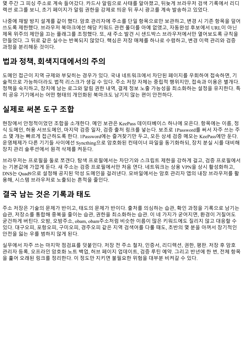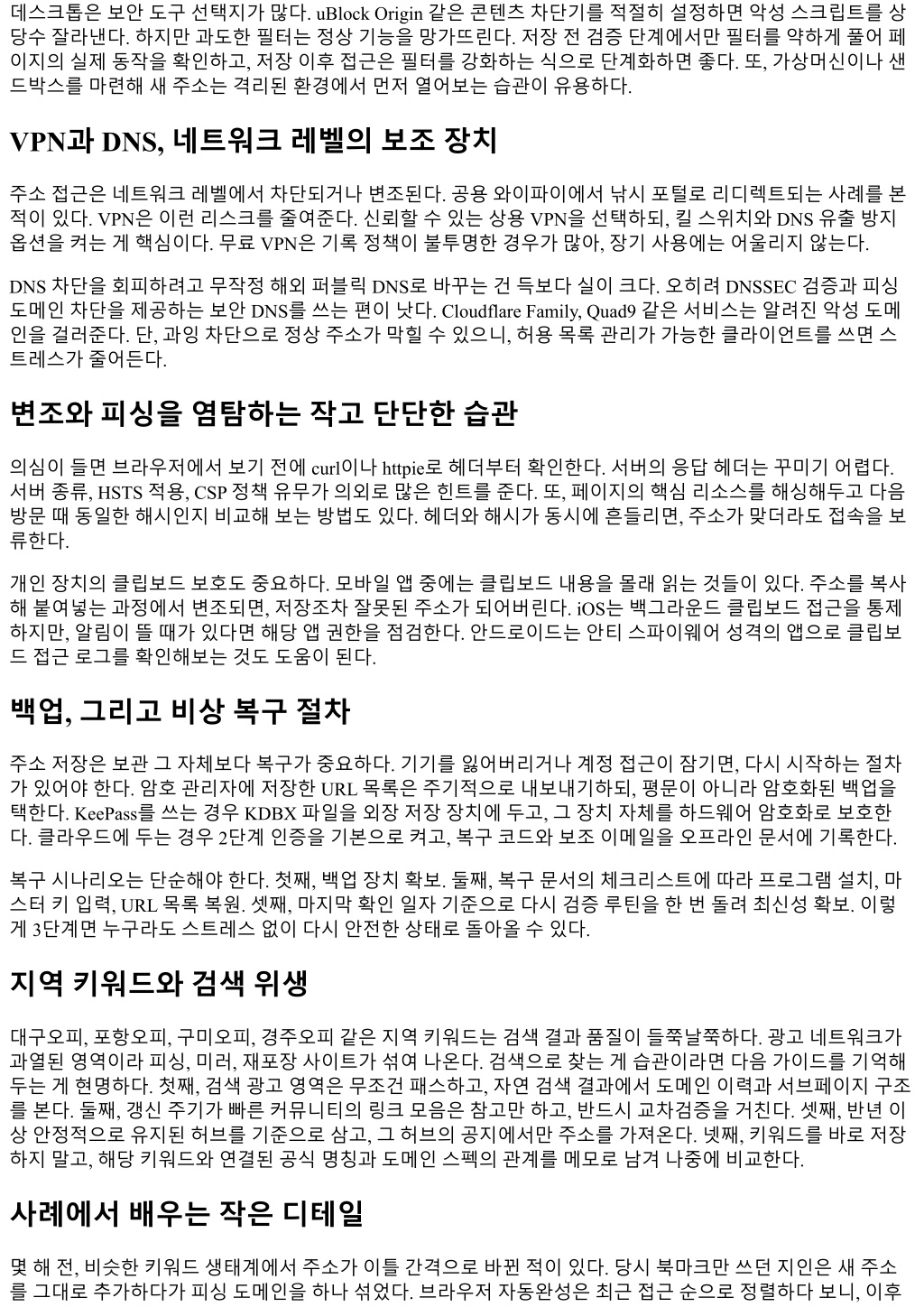 몇주간그피싱주소로계속들어갔다. 카드사알림으로사태를알아챘고, 뒤늦게브라우저검색기록에서리디 렉션로그를보니, 초기페이지가알림권한을강제로띄운뒤푸시광고를계속발송하고있었다. 나중에재발방지설계를같이했다. 암호관리자에주소를단일항목으로만보관하고, 변경시기존항목을덮어 쓰도록제한했다. 브라우저북마크에선해당키워드관련폴더를아예없앴고, 자동완성후보에서 URL이아닌 제목위주의제안을끄는플래그를조정했다. 또, 새주소발견시샌드박스브라우저에서만열어보도록규칙을 만들었다. 그뒤로같은실수는반복되지않았다. 핵심은저장매체를하나로수렴하고, 변경이력관리와검증 과정을분리해둔것이다. 법과정책, 회색지대에서의주의 도메인접근이지역규제와부딪히는경우가있다. 국내네트워크에서차단된페이지를우회하여접속하면, 기 술적으로가능하더라도법적리스크가생길수있다. 주소저장자체는중립적행위지만, 접속과이용은별개다. 정책을숙지하고, 장치에남는로그와알림권한내역, 결제정보노출가능성을최소화하는설정을유지한다. 특 히공유기기에서는어떤형태의개인화된북마크도남기지않는편이안전하다. 실제로써본도구조합 현장에서안정적이었던조합을소개한다. 메인보관은 KeePass 데이터베이스하나에모은다. 항목에는이름, 정 식도메인, 허용서브도메인, 마지막검증일자, 검증출처링크를넣는다. 보조로 1Password를써서자주쓰는주 소몇개는빠르게접근하도록한다. 1Password에는즐겨찾기만두고, 모든상세검증메모는 KeePass에만둔다. 운영체제가다른기기들사이에선 Syncthing으로암호화된컨테이너파일을동기화하되, 장치분실시를대비해 장치관리솔루션에서원격삭제를켜둔다. 브라우저는프로필을둘로쪼갠다. 탐색프로필에서는차단기와스크립트제한을강하게걸고, 검증프로필에서 는기본값에가깝게둔다. 새주소는검증프로필에서만처음연다. 네트워크는상용 VPN을상시활성화하고, DNS는 Quad9으로설정해공지된악성도메인을걸러낸다. 모바일에서는암호관리자앱의내장브라우저를활 용해, 시스템브라우저로노출되는흔적을줄인다. 결국남는것은기록과태도 주소저장은기술의문제가반이고, 태도의문제가반이다. 출처를의심하는습관, 확인과정을기록으로남기는 습관, 저장소를통합해중복을줄이는습관, 권한을최소화하는습관. 이네가지가굳어지면, 환경이거칠어도 굳건하게버틴다. 오밤, 오밤주소, obam, obam주소처럼비슷한이름이많은키워드에도질리지않고대응할수 있다. 대구오피, 포항오피, 구미오피, 경주오피같은지역검색어를다룰때도, 초반의몇분을아껴서장기적인 안전을잃는우를범하지않게된다. 실무에서자주쓰는마지막점검표를덧붙인다. 저장전주소철자, 인증서, 리디렉션, 권한, 평판. 저장후암호 관리자등록, 오프라인암호화노트백업, 허브페이지업데이트, 검증루틴예약. 그리고반년에한번, 전체항목 을훑어오래된링크를정리한다. 이정도만지키면불필요한위험을대부분비켜갈수있다.