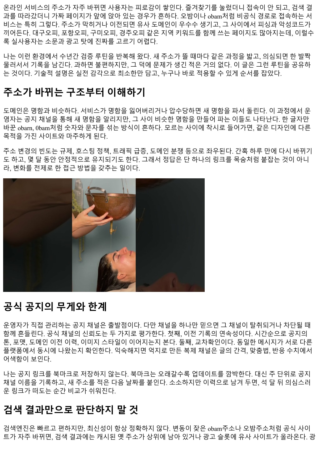 온라인서비스의주소가자주바뀌면사용자는피로감이쌓인다. 즐겨찾기를눌렀더니접속이안되고, 검색결 과를따라갔더니가짜페이지가앞에앉아있는경우가흔하다. 오밤이나 obam처럼비공식경로로접속하는서 비스는특히그렇다. 주소가막히거나이전되면유사도메인이우수수생기고, 그사이에서피싱과악성코드가 끼어든다. 대구오피, 포항오피, 구미오피, 경주오피같은지역키워드를함께쓰는페이지도많아지는데, 이럴수 록실사용자는소문과광고탓에진짜를고르기어렵다. 나는이런환경에서수년간검증루틴을반복해왔다. 새주소가뜰때마다같은과정을밟고, 의심되면한발짝 물러서서기록을남긴다. 과하면불편하지만, 그덕에문제가생긴적은거의없다. 이글은그런루틴을공유하 는것이다. 기술적설명은실전감각으로최소한만담고, 누구나바로적용할수있게순서를잡았다. 주소가바뀌는구조부터이해하기 도메인은명함과비슷하다. 서비스가명함을잃어버리거나압수당하면새명함을파서돌린다. 이과정에서운 영자는공지채널을통해새명함을알리지만, 그사이비슷한명함을만들어파는이들도나타난다. 한글자만 바꾼 obarn, 0bam처럼숫자와문자를섞는방식이흔하다. 모르는사이에착시로들어가면, 같은디자인에다른 목적을가진사이트와마주하게된다. 주소변경의빈도는규제, 호스팅정책, 트래픽급증, 도메인분쟁등으로좌우된다. 간혹하루만에다시바뀌기 도하고, 몇달동안안정적으로유지되기도한다. 그래서정답은단하나의링크를목숨처럼붙잡는것이아니 라, 변화를전제로한접근방법을갖추는일이다. 공식공지의무게와한계 운영자가직접관리하는공지채널은출발점이다. 다만채널을하나만믿으면그채널이탈취되거나차단될때 함께흔들린다. 공식채널의신뢰도는두가지로평가한다. 첫째, 이전기록의연속성이다. 시간순으로공지의 톤, 포맷, 도메인이전이력, 이미지스타일이이어지는지본다. 둘째, 교차확인이다. 동일한메시지가서로다른 플랫폼에서동시에나왔는지확인한다. 익숙해지면억지로만든복제채널은글의간격, 맞춤법, 반응수치에서 어색함이보인다. 나는공지링크를북마크로저장하지않는다. 북마크는오래갈수록업데이트를깜박한다. 대신주단위로공지 채널이름을기록하고, 새주소를적은다음날짜를붙인다. 소소하지만이력으로남겨두면, 석달뒤의심스러 운링크가떠도는순간비교가쉬워진다. 검색결과만으로판단하지말것 검색엔진은빠르고편하지만, 최신성이항상정확하지않다. 변동이잦은 obam주소나오밤주소처럼공식사이 트가자주바뀌면, 검색결과에는캐시된옛주소가상위에남아있거나광고슬롯에유사사이트가올라온다. 광