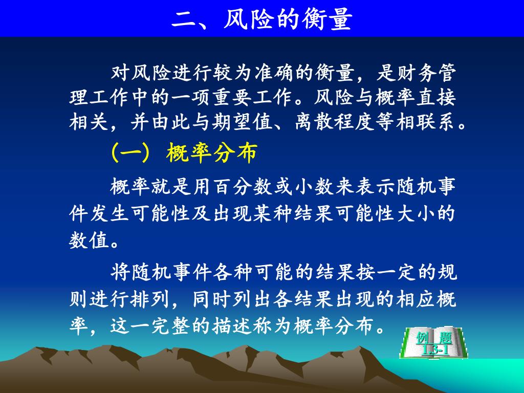 二、风险的衡量 例 题 1.3-1 对风险进行较为准确的衡量,是财务管理工作中的一项重要工作。风险与概率直接相关,并由此与期望值、离散程度等相联系。 (一) 概率分布 概率就是用百分数或小数来表示随机事件发生可能性及出现某种结果可能性大小的数值。 将随机事件各种可能的结果按一定的规则进行排列,同时列出各结果出现的相应概率,这一完整的描述称为概率分布。