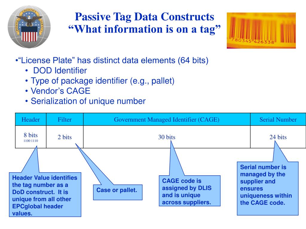 Passive Tag Data Constructs “What information is on a tag” • “License Plate” has distinct data elements (64 bits) • DOD Identifier • Type of package identifier (e.g., pallet) • Vendor’s CAGE • Serialization of unique number Serial number is managed by the supplier and ensures uniqueness within the CAGE code. Header Value identifies the tag number as a DoD construct. It is unique from all other EPCglobal header values. CAGE code is assigned by DLIS and is unique across suppliers. Case or pallet.