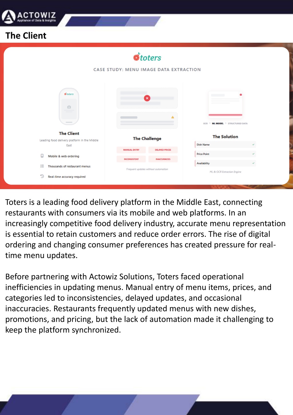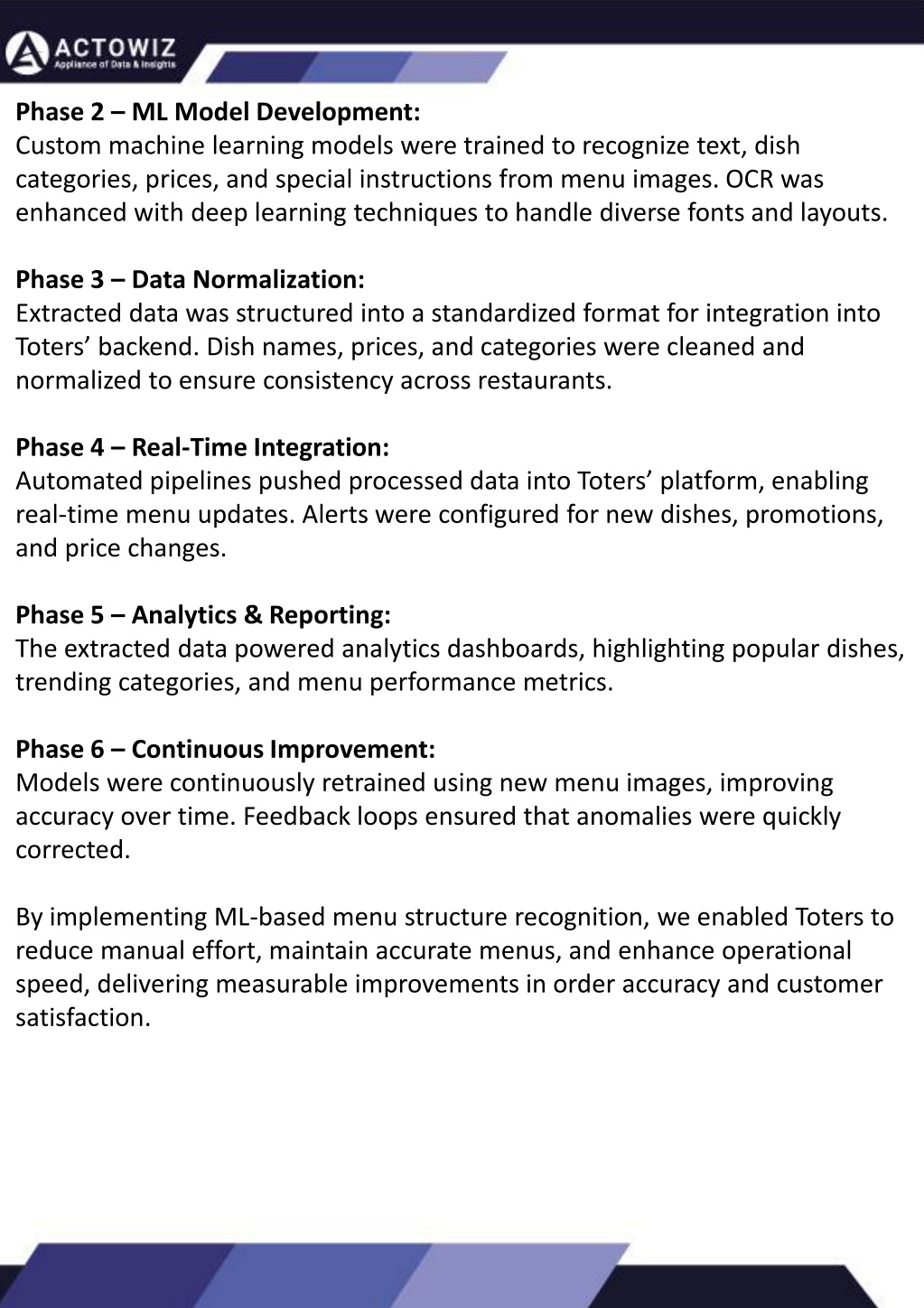 How we enabled Toters Menu Image Recognition using ML & OCR to automate menu analytics, improve accuracy, and streamline food ordering processes.<br>