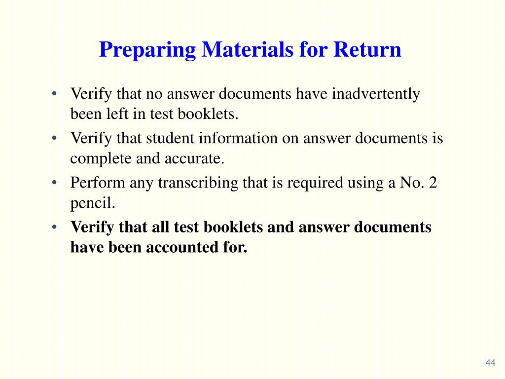 Preparing Materials for Return • Verify that no answer documents have inadvertently been left in test booklets. • Verify that student information on answer documents is complete and accurate. • Perform any transcribing that is required using a No. 2 pencil. • Verify that all test booklets and answer documents have been accounted for.