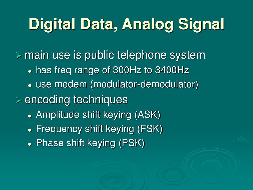 Digital Data, Analog Signal • main use is public telephone system • has freq range of 300Hz to 3400Hz • use modem (modulator-demodulator) • encoding techniques • Amplitude shift keying (ASK) • Frequency shift keying (FSK) • Phase shift keying (PSK)