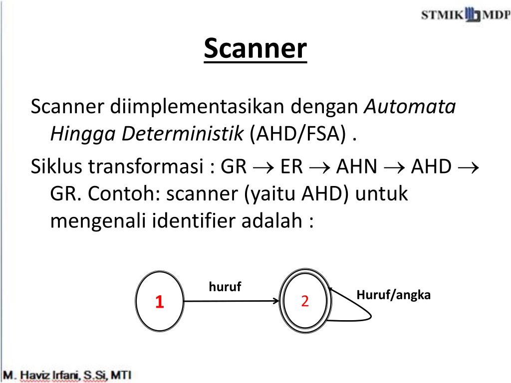Scanner Scanner diimplementasikandenganAutomata HinggaDeterministik(AHD/FSA) . Siklustransformasi : GR ER AHN AHD GR. Contoh: scanner (yaitu AHD) untukmengenali identifier adalah : 1 2 huruf Huruf/angka