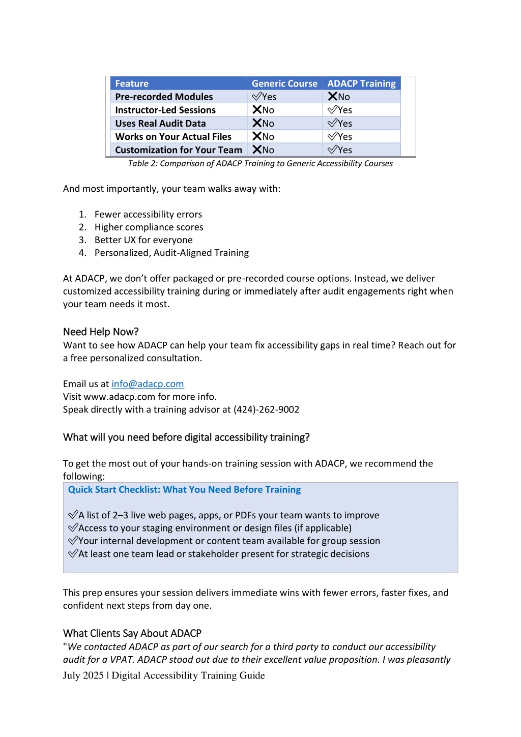 Feature Pre-recorded Modules Instructor-Led Sessions Uses Real Audit Data Works on Your Actual Files Customization for Your Team ❌ No Table 2: Comparison of ADACP Training to Generic Accessibility Courses Generic Course ADACP Training ✅ Yes ❌ No ❌ No ❌ No ❌ No ✅ Yes ✅ Yes ✅ Yes ✅ Yes And most importantly, your team walks away with: 1.Fewer accessibility errors 2.Higher compliance scores 3.Better UX for everyone 4.Personalized, Audit-Aligned Training At ADACP, we don’t offer packaged or pre-recorded course options. Instead, we deliver customized accessibility training during or immediately after audit engagements right when your team needs it most. Need Help Now? Need Help Now? Want to see how ADACP can help your team fix accessibility gaps in real time? Reach out for a free personalized consultation. Email us at info@adacp.com Visit www.adacp.com for more info. Speak directly with a training advisor at (424)-262-9002 What will What will you you need before digital accessibility training? need before digital accessibility training? To get the most out of your hands-on training session with ADACP, we recommend the following: Quick Start Checklist: What You Need Before Training ✅ A list of 2–3 live web pages, apps, or PDFs your team wants to improve ✅ Access to your staging environment or design files (if applicable) ✅ Your internal development or content team available for group session ✅ At least one team lead or stakeholder present for strategic decisions This prep ensures your session delivers immediate wins with fewer errors, faster fixes, and confident next steps from day one. What Clients Say About ADACP What Clients Say About ADACP "We contacted ADACP as part of our search for a third party to conduct our accessibility audit for a VPAT. ADACP stood out due to their excellent value proposition. I was pleasantly July 2025 | Digital Accessibility Training Guide