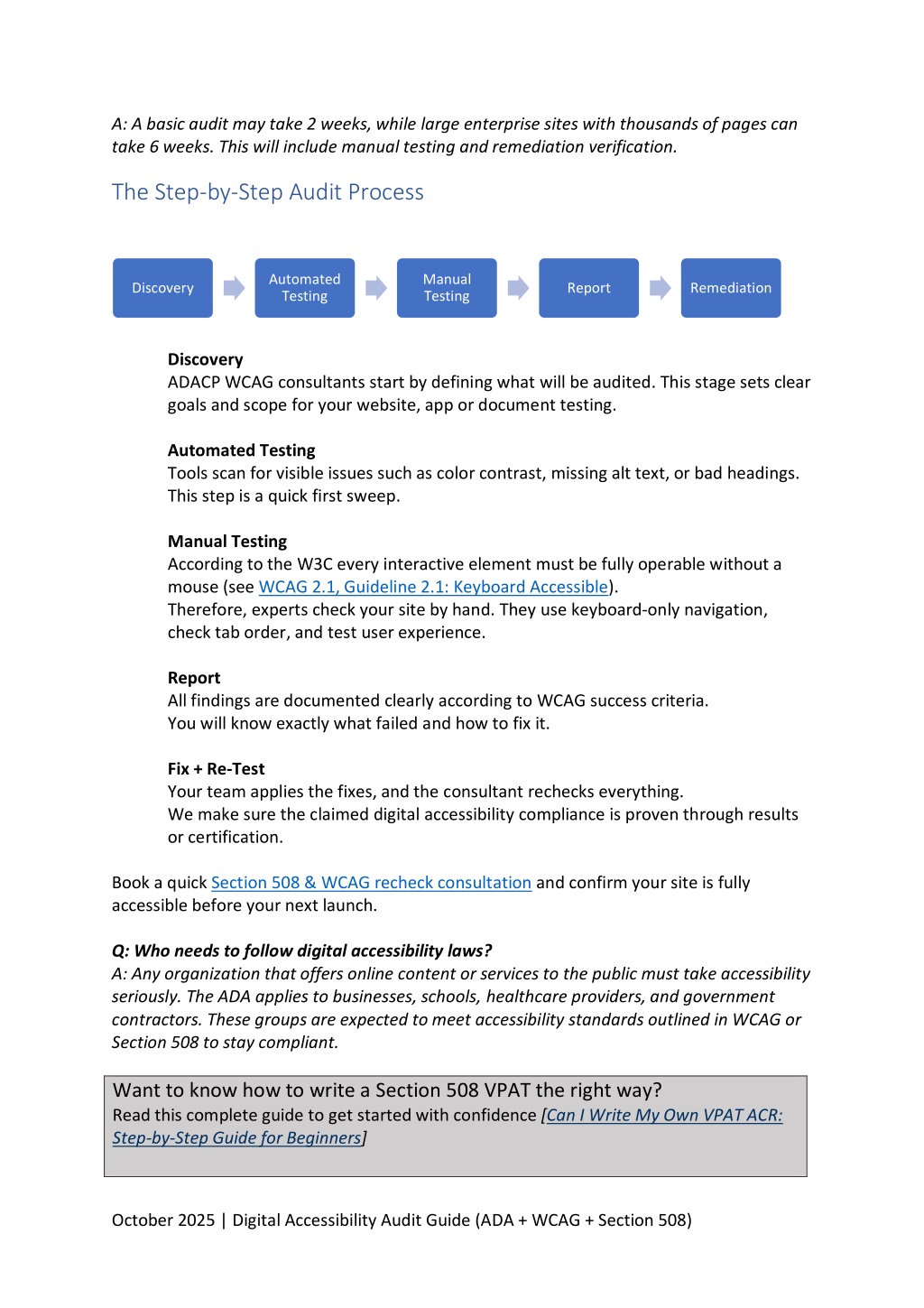 A: A basic audit may take 2 weeks, while large enterprise sites with thousands of pages can take 6 weeks. This will include manual testing and remediation verification. The Step-by-Step Audit Process Automated Testing Manual Testing Discovery Report Remediation Discovery ADACP WCAG consultants start by defining what will be audited. This stage sets clear goals and scope for your website, app or document testing. Automated Testing Tools scan for visible issues such as color contrast, missing alt text, or bad headings. This step is a quick first sweep. Manual Testing According to the W3C every interactive element must be fully operable without a mouse (see WCAG 2.1, Guideline 2.1: Keyboard Accessible). Therefore, experts check your site by hand. They use keyboard-only navigation, check tab order, and test user experience. Report All findings are documented clearly according to WCAG success criteria. You will know exactly what failed and how to fix it. Fix + Re-Test Your team applies the fixes, and the consultant rechecks everything. We make sure the claimed digital accessibility compliance is proven through results or certification. Book a quick Section 508 & WCAG recheck consultation and confirm your site is fully accessible before your next launch. Q: Who needs to follow digital accessibility laws? A: Any organization that offers online content or services to the public must take accessibility seriously. The ADA applies to businesses, schools, healthcare providers, and government contractors. These groups are expected to meet accessibility standards outlined in WCAG or Section 508 to stay compliant. Want to know how to write a Section 508 VPAT the right way? Read this complete guide to get started with confidence [Can I Write My Own VPAT ACR: Step-by-Step Guide for Beginners] October 2025 | Digital Accessibility Audit Guide (ADA + WCAG + Section 508)