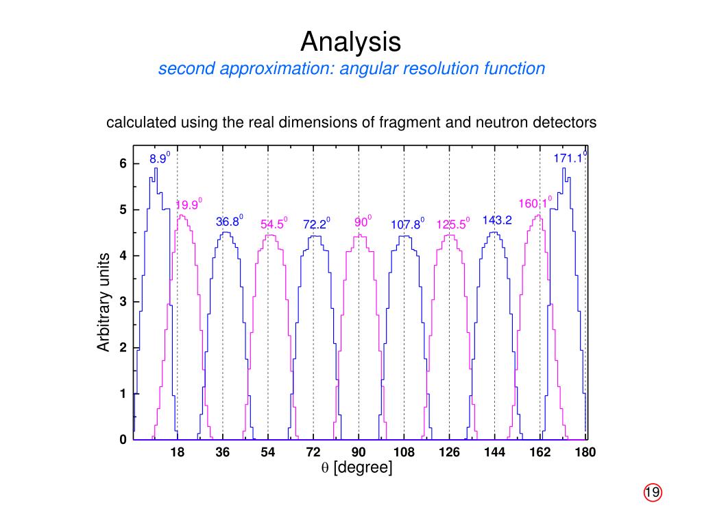 Analysissecond approximation: angular resolution function calculated using the real dimensions of fragment and neutron detectors