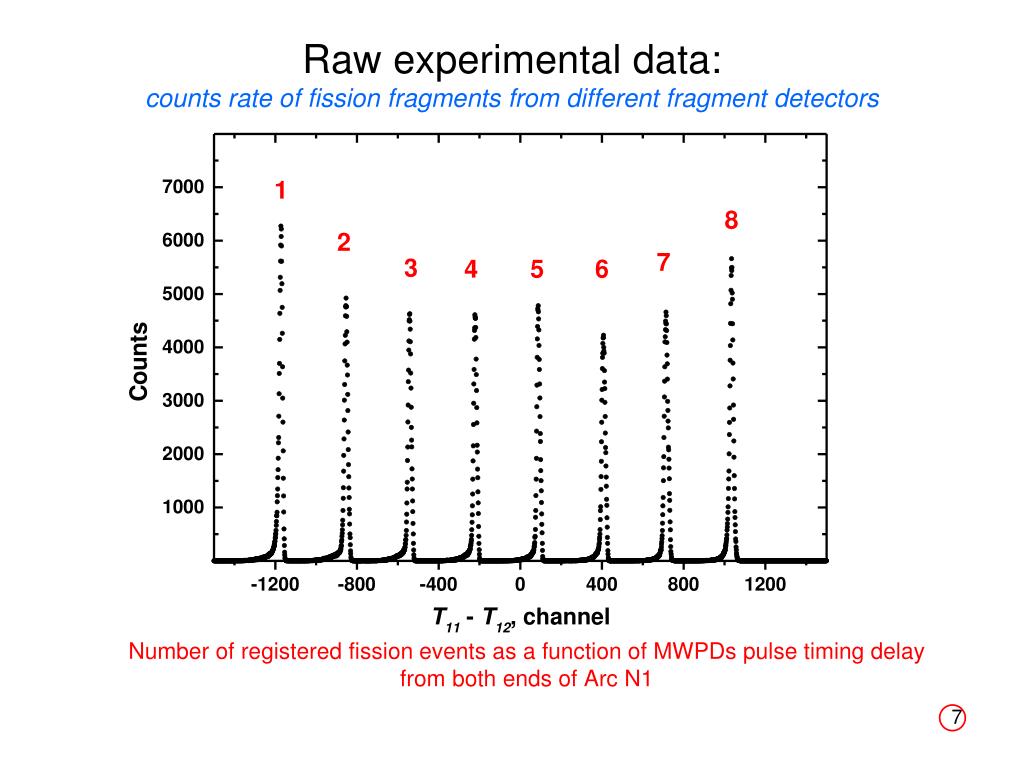 Raw experimental data: counts rate of fission fragments from different fragment detectors Number of registered fission events as a function of MWPDs pulse timing delay from both ends of Arc N1