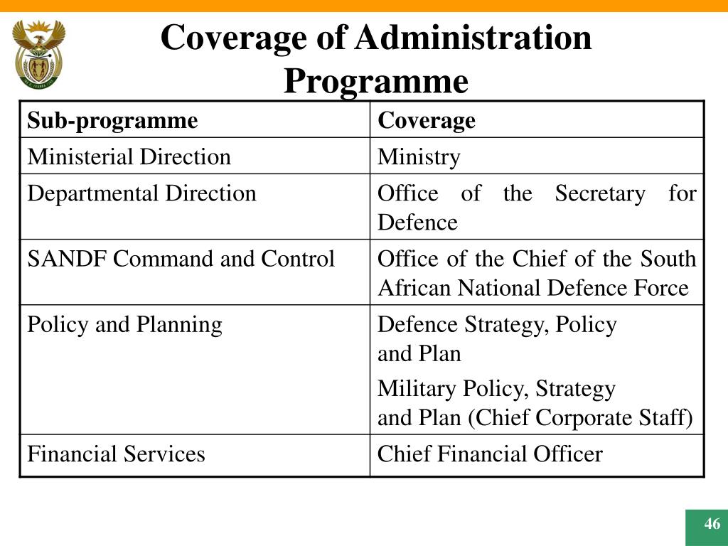 CHAPTER THREE Administration • Purpose. The Defence Administration Programme conducts policy development, management and administration of the department. • Measurable Objectives • Provision of sound defence direction and advice • Providing the defence related social responsibilities • Developing consensus on defence • Providing sound Policy and administration • Provision of contingency ready defence capabilities • Providing framework for systemic M&E Output table