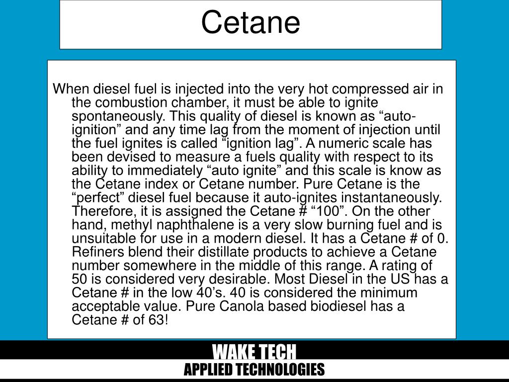Cetane When diesel fuel is injected into the very hot compressed air in the combustion chamber, it must be able to ignite spontaneously. This quality of diesel is known as “auto-ignition” and any time lag from the moment of injection until the fuel ignites is called “ignition lag”. A numeric scale has been devised to measure a fuels quality with respect to its ability to immediately “auto ignite” and this scale is know as the Cetane index or Cetane number. Pure Cetane is the “perfect” diesel fuel because it auto-ignites instantaneously. Therefore, it is assigned the Cetane # “100”. On the other hand, methyl naphthalene is a very slow burning fuel and is unsuitable for use in a modern diesel. It has a Cetane # of 0. Refiners blend their distillate products to achieve a Cetane number somewhere in the middle of this range. A rating of 50 is considered very desirable. Most Diesel in the US has a Cetane # in the low 40’s. 40 is considered the minimum acceptable value. Pure Canola based biodiesel has a Cetane # of 63!