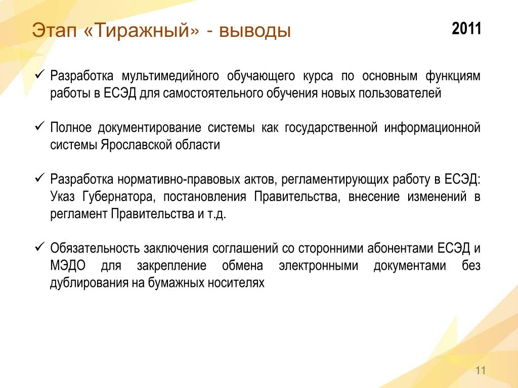 2011 Этап «Тиражный» - выводы • Разработка мультимедийного обучающего курса по основным функциям работы в ЕСЭД для самостоятельного обучения новых пользователей • Полное документирование системы как государственной информационной системы Ярославской области • Разработка нормативно-правовых актов, регламентирующих работу в ЕСЭД: Указ Губернатора, постановления Правительства, внесение изменений в регламент Правительства и т.д. • Обязательность заключения соглашений со сторонними абонентами ЕСЭД и МЭДО для закрепление обмена электронными документами без дублирования на бумажных носителях